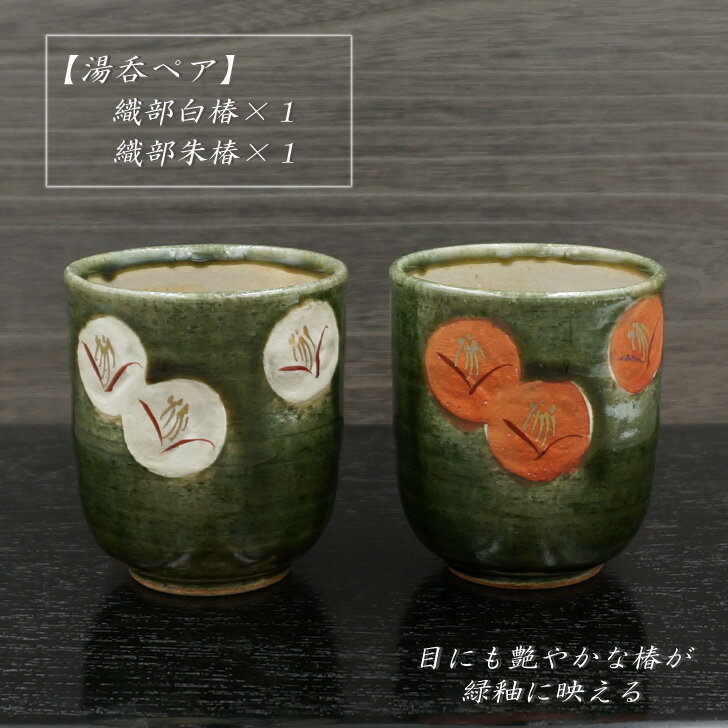 【箱入り】織部椿 ペア湯呑〈夫婦湯呑 伝統 モダン おしゃれ 織部 織部焼 手造り 土物 御祝 ギフト プレゼント お歳暮 無料ラッピング 桐箱 敬老の日 母の日 父の日 誕生日 贈り物 美濃焼 〉