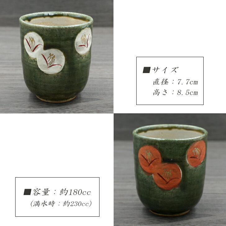 商品情報商品詳細■サイズ 直径約7.7cm x 高さ約8.5cm(2)■容量 約180cc(満水時:約230cc)×2個■重さ 約200g x 2個■素材 陶器■手触り しっとり、つるっとしています■電子レンジ×■食洗機〇■オーブン×※化粧箱入りご注意※土ものらしさを大切に一品ずつ手づくりしており、焼きあがりの色、サイズ、風合い等が全て異なります。予めご了承いただくと共に、それぞれの景色をお楽しみいただけると幸いです。※お客様のお使いのモニターのモニター設定、お部屋の照明等により実際の商品と色味が異なって見える場合がございます。箱の変更こちらの商品は化粧箱入りですが、不動窯オリジナルの【桐箱】に変更できます。ご希望の方は「まとめて購入」欄で桐箱も一緒にカートに入れ、商品と一緒にご注文ください。【箱入り】織部椿 ペア湯呑〈夫婦湯呑 伝統 モダン おしゃれ 織部 織部焼 手造り 土物 御祝 ギフト プレゼント お歳暮 無料ラッピング 桐箱 敬老の日 母の日 父の日 誕生日 贈り物 美濃焼 〉 緑釉が生み出す色文様に艶やかな椿柄が映える。ご夫婦で、カップルで、そしてギフトや贈り物にいかがですか? 美濃の陶工たちが蓄積した伝統技術や桃山の自由闊達な創造性を大切にし、彩られた過飾なうつわではなく、普遍的な美しさの中に独自の個性をしのばせる。織部釉に施された艶やかな椿柄。赤と金が美しく映える。ご夫婦で、カップルで、親子で、ほど良いペア感が心地いい。高級感のある箱入りなので、ギフトにも最適!ひずんだフォルム、艶やかな色彩、その独創的なうつわを生んだ「へうげもの」の美的感覚を貫く自由闊達な桃山の時代精神は時代を経て今もなおその輝きを失わず今日まで受け継いでいます。※こちらの商品は高級感のある箱入りですが、 不動窯オリジナルの「桐箱」に変更することが できます。 大切な方への贈り物におすすめです。 変更をご希望の方は、「まとめて購入」欄で 桐箱も一緒にカートに入れ、商品と一緒に ご注文ください。 2