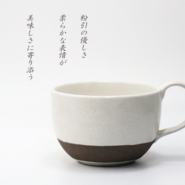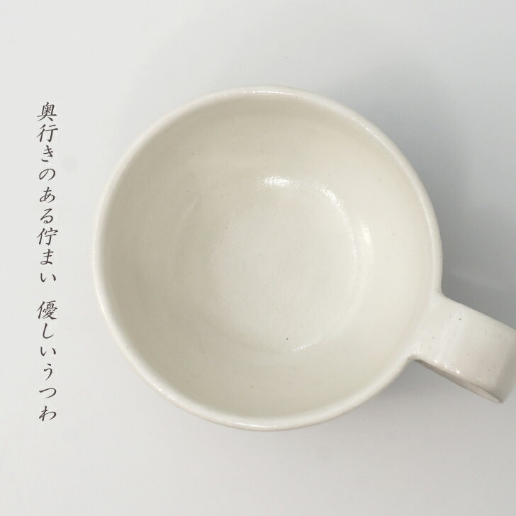 商品情報商品詳細■サイズ 直径約10cm(持ち手含めて約14cm)x高さ約7cm■重さ 約240g■容量 約320cc(満水時:約450cc)■素材 陶器■手触り しっとり、つるっとしています■電子レンジ〇■食洗機〇■オーブン×ご注意※土ものらしさを大切に一品ずつ手づくりしており、焼きあがりの色、サイズ、風合い等が全て異なります。予めご了承いただくと共に、それぞれの景色をお楽しみいただけると幸いです。※お客様のお使いのモニターのモニター設定、お部屋の照明等により実際の商品と色味が異なって見える場合がございます。ラッピングラッピング包装を無料で承っております。ご希望の方は、ご指定の内容を選択してから、商品を買い物かごに入れて下さい。粉引くし目 スープカップ《スープ マグ 大きめ カフェオレ たっぷり モダン おしゃれ 織部 織部焼 伝統的 手造り 土物 御祝 内祝 ギフト プレゼント 母の日 父の日 敬老の日 誕生日 贈り物 お歳暮 和食器 美濃焼》 伝統的な技法と釉薬(色)を用いながらも、いまの生活に馴染むようモダンに仕上がった”くし目”シリーズのスープカップ。たっぷりサイズのマグカップとしても。 美濃の陶工たちが蓄積した伝統技術や桃山の自由闊達な創造性を大切にし、彩られた過飾なうつわではなく、普遍的な美しさの中に独自の個性をしのばせる。伝統的な技法と釉薬(色)を用いながらも、いまの生活に馴染むようモダンに仕上がったスープカップ。釉薬部分の光沢と、ザラっとした”くし目”部分の対比がかわいくもモダンな雰囲気を醸し出しています。粉引(Kohiki)粉を引くと書いてこひきと読む黒い土の上に白い土を泥状に上掛けすることで土ものの自然な風合いをもった優しい白8分目で320cc入るたっぷりサイズ。カフェオレボウルなど大きめマグカップとしても活躍します。さらに見た目よりも軽い!もちろん電子レンジも使用可能です。 2