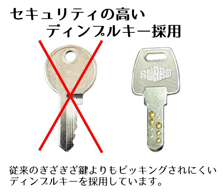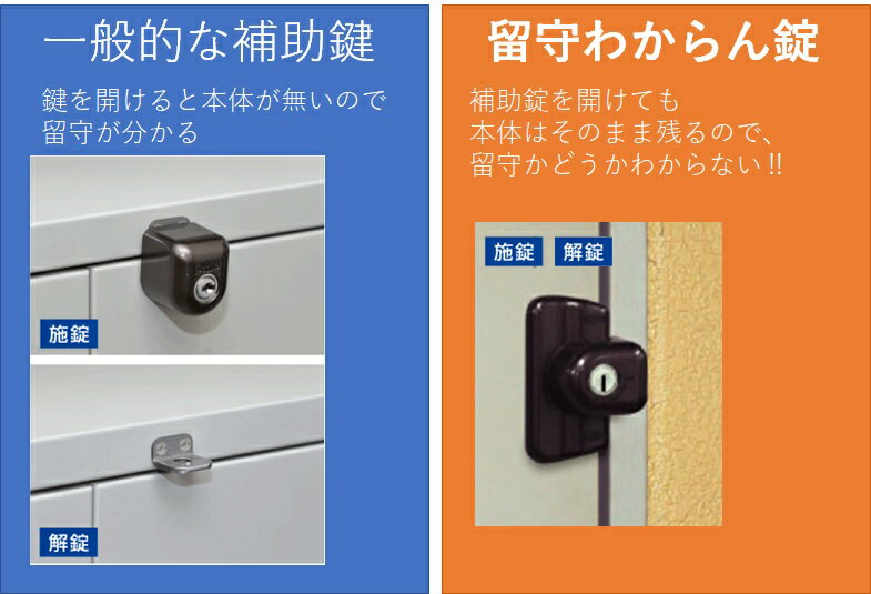 【製品仕様】 メーカー ガードロック 型番 No.557 商品名 留守わからん錠 非常脱出機能付 サイズ ・ロック本体:86×57×44mm・取付金具:153×87×33mm 材質 ・ロック本体:鉛合金製、塗装仕上げ・シリンダー部:真鍮製、クロームメッキ仕上げ・取付金具&取付プレート:ステンレス製、亜鉛合金製・キー:真鍮製、ニッケルメッキ仕上げカテゴリトップ > セキュリティ > 補助錠 玄関ドアをダブルロック!!防犯性をアップ! 取付は簡単!工具不要!穴開け不要!ダブルロックにできる補助錠です。 防犯性の高いディンプルキーを採用。 サムターン廻し、ピッキング、カム送り不正解錠対策に! 穴開けの必要が無く、賃貸・物件管理にもおすすめ! 【一般的な補助錠】と【留守わからん錠】の違い 「一般的な補助錠」は鍵を開けると本体が無い状態になるので、他人に留守かどうかが分かってしまいます。 「留守わからん錠」は鍵がどのような状態でも、本体が残るので留守かどうかがわからないので、安全度UP!! また「緊急脱出機能」があるため、中から鍵を開けることが可能!!(一般的の補助錠はできません) ダブルロックしたいが、ここまでの機能は要らない場合(一般扉用)・・・ ・「留守わからん錠」の安い商品(「緊急脱出機能」無し) ・ピッキングに強いディンプルキー ・安価な南京錠式 高セキュリティ 従来のぎざぎざ鍵よりもピッキングされにくいディンプルキーを採用しています。 鍵は4本付属 ※鍵を増やしたい場合はご相談ください。(スペアキーのみ別注対応) 購入前に必ずご確認ください 「必ずご確認ください。」の扉で使えます。買う前に必ずチェックしてください。 ・カブセ扉の場合、こちらを購入ください ※「緊急脱出機能」無しとなります。 注意事項 通常の補助錠と違い、中から鍵を開ける「緊急脱出機能」が付いています。 ・「緊急脱出機能」が不要な場合、こちらをおすすめいたします