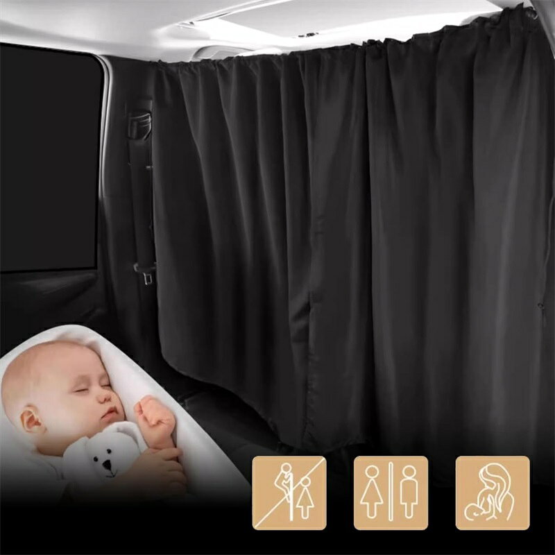遮光可能な生地を採用し、効果的に日差しを遮断し、断熱効果もあります。車外からの視線や光を遮り、プライバシーを守ります。使用しない時は開けることができます。 前席と後席の間に設置するパーティションです。服を着替えたり、授乳したり、車内での宿泊、紫外線対策など、様々な用途に役立ちます。また、エアコンの効率も向上させます。 車内のピラー部分にフックをかけるだけ!用途に合わせてカーテンを移動したり取り外したり、前後で仕切りとしても使用できます。※購入前に、車のピラー部分に隙間があり、取り付け用フックのサイズを確認してください。 室内の空間の大きさに応じてロープの長さを調整できるので、多様な車種に適用できます。