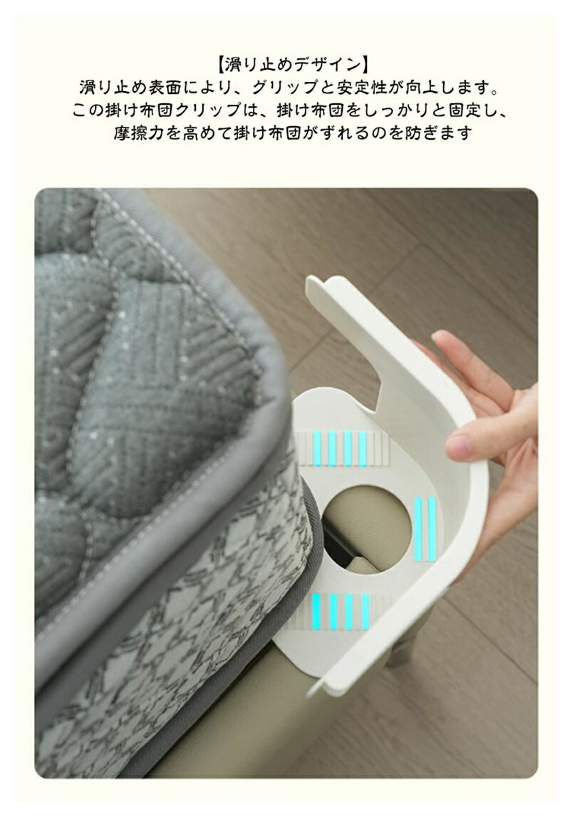 【マルチポイント固定】複数の固定点があり、シーツと布団を全方位に固定することができます。固定装置を通して、ベッドにしっかりと固定され、睡眠中にずれるのを防ぎます。 【滑り止めデザイン】滑り止め表面により、グリップと安定性が向上します。この掛け布団クリップは、掛け布団をしっかりと固定し、摩擦力を高めて掛け布団がずれるのを防ぎます 【耐久性】耐摩耗性のPPとABS材料で作られ、厚く処理された、耐久性があり、再利用可能です。 【操作が簡単】この掛け布団クリップは使いやすく、寝具に穴を開ける必要がありません。掛け布団を簡単に所定の位置に固定できます。 【幅広い用途】シングルベッド、ダブルベッドなど あらゆるタイプのベッドに適しておます。家庭、ホテルなどの様々な睡眠シーンで広く使用することができます。