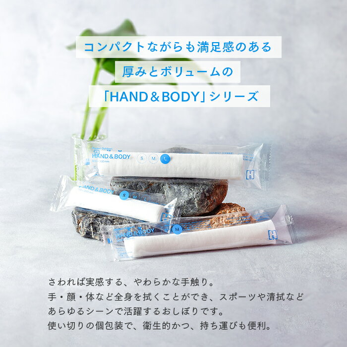 広告文責 FSX株式会社/042-576-9131 メーカー(製造) FSX株式会社 区分 日本製・化粧品 商品名 紙おしぼり ハンドアンドボディ M (HAND&BODY M) メーカー FSX 株式会社 サイズ 【パッケージサイズ】横40mm×縦215mm 【原紙展開サイズ】横300mm×縦300mm 入り数 100本 原紙 CPC素材(レーヨン・ポリエステル) 香り 無香料 成分 水、PG、ベンザルコニウムクロリド、ブチルカルバミン酸ヨウ化プロピニル、クエン酸Na、ポロキサマー181、クエン酸、タングステン酸アンチモン酸Na、タングステン酸アンチモン酸バナジルK 生産国 日本製 消費期限 製造から1年6ヵ月 商品の特長 ●手・体・顔、全身を拭ける使い捨てウェットタオル。 ●さわれば実感する、タオルより柔らかな手触り。 ●保湿成分により、乾燥から守りつつもベタつかないサラッとした使い心地。 ●衛生的な個包装で持ち運びや配布に便利。 ●キャンプ・アウトドア・スポーツなどの普段使いから、病中や災害時など入浴できないシーンでも活躍します。 ●凍らせても簡単に広げることができる耐凍素材で夏場のリフレッシュや差し入れにも。 ●外装フィルムは環境に配慮したバイオマス10%配合。 ●ノンアルコール・無香料・パラベンフリー。 ●生地は肌触りがよく耐久性に優れたレーヨンポリエステル素材で、保水性・保湿性に優れたエアレードパルプを挟んだ3層ハイブリットCPC素材。 ●保温性に優れた特大・特厚に加え、強度と伸縮性を兼ね備えた使いやすさ。 ●ウォータージェットの水の力で繊維を織っています。 使用上の注意 ・お肌に合わない時は、使用を中止し、次のような場合には皮膚科専門医にご相談ください。(1)使用中、赤み、はれ、かゆみ、刺激、色抜け(白斑等)や黒ずみ等の異常が現れた場合、(2)使用したお肌に、直射日光があたって上記のような異常が現れた場合。そのまま使用を続けますと、症状を悪化させることがあります。・傷やはれもの、しっしん等、異常のある部位はお使いにならないでください。・高温、直射日光を避けて保管してください。・乳幼児の手の届かないところに保管してください。・本品は水に溶けませんので、トイレには流さないでください。・開封後はなるべく早めにご使用ください。・まれに黒や茶褐色の点がありますが、原料由来のものですので、品質に問題はございません。 関連商品 紙おしぼり ハンドアンドボディ S (HAND&BODY S) 50本 関連商品 紙おしぼり ハンドアンドボディ L (HAND&BODY L) 50本