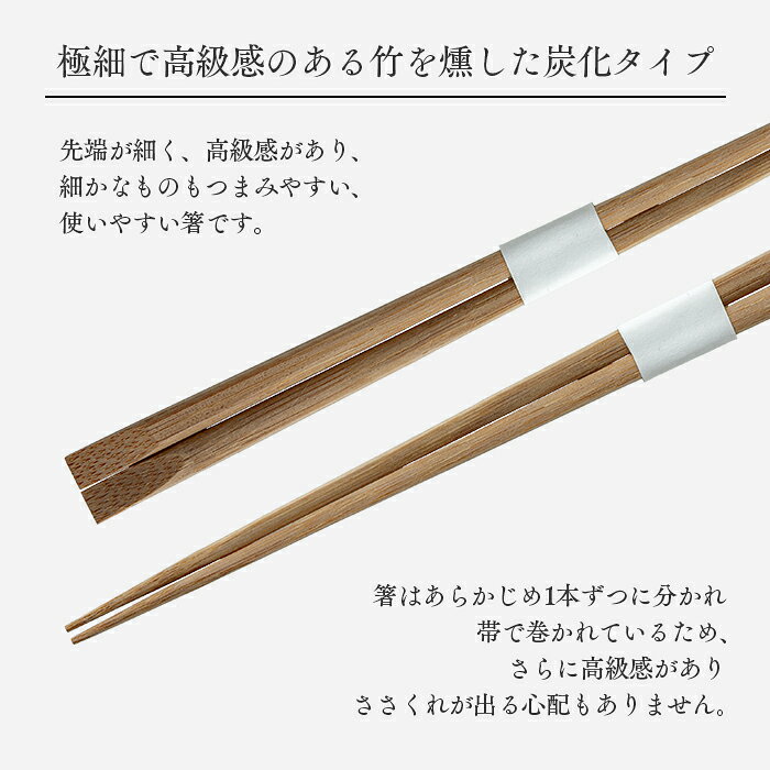 商品名 極細炭化竹角天削箸 白帯巻 235mm メーカー 株式会社 明海 サイズ 長さ23.5cm 先端約φ1.8mm 数量 1500膳 (50膳×30パック) 材質 竹製 商品の特長 ●竹を燻した炭化タイプ●先端を細くし、高級感があり、かつ細かいものもつまみやすい、使いやすい箸●割れている箸を帯で巻いているので、さらに高級感が増し、割った時のささくれも出ません 関連商品 極細炭化竹角天削箸 白帯巻 235mm 50膳