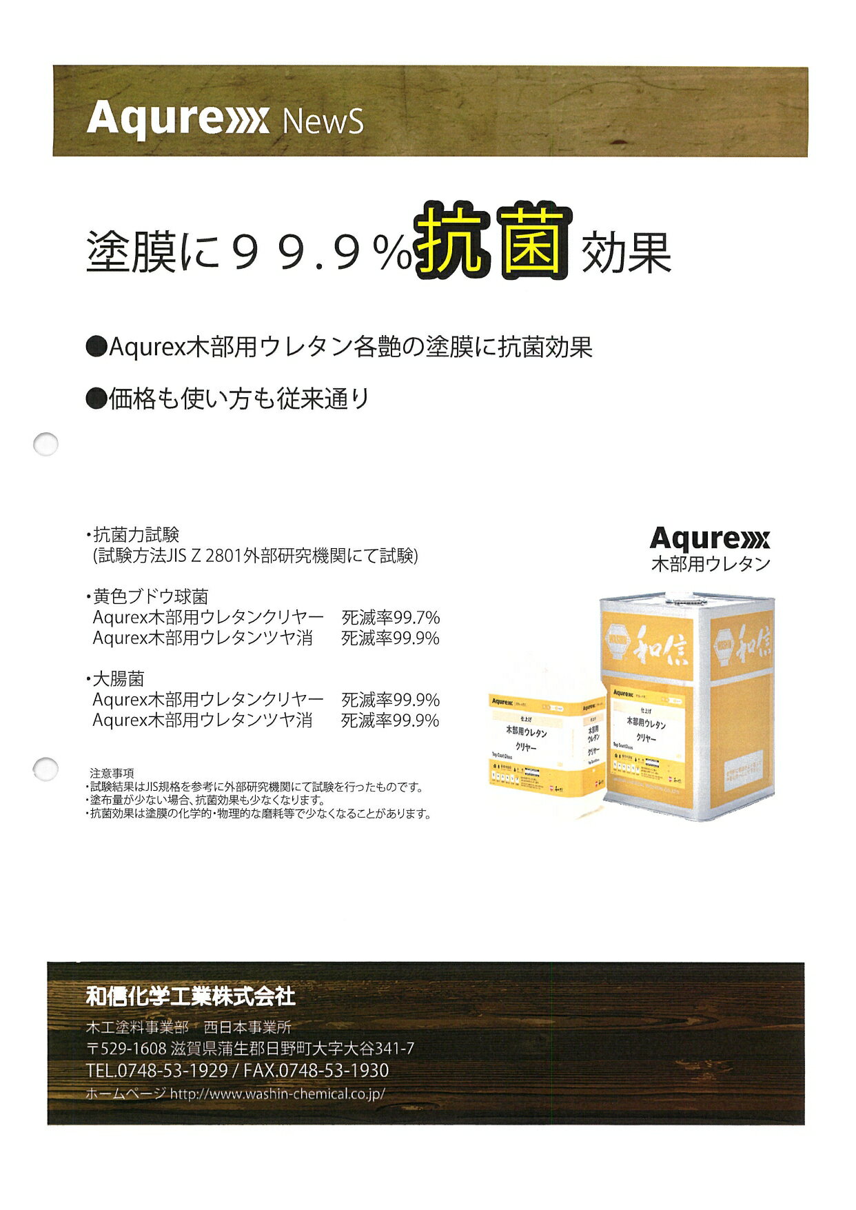 ●Washin(和信化学工業)は商品全てメーカー手配ですが、 通常、平日12時までのご注文は土・日・祝日を除く翌営業日に発送致します。 (メーカー在庫の無い場合はお待ちいただくことがございますので、お急ぎの際はお問合せ下さい) ●沖縄・その他離島では、別途送料を頂戴いたします。 事前にお問合せ頂くか、ご注文後お見積もり金額をお知らせいたします。 【用途】 床、階段、手摺り、内壁、内装ドア、ドア枠、廻り縁、巾木、カウンター、収納扉などのあらゆる内装木部や天板などの家具の仕上げに最適です。 【特長】 〇安心して使える屋内木部用水性塗料の代名詞と呼ばれ、T-VOC 0.3%未満のインテリア木部全般に対応する仕上げ剤です。 〇速乾&低臭、耐薬品性と肉持ちに優れた強靭な塗膜をつくり、インテリア木部を美しく護ります。 〇密着性が極めて優れており旧塗膜の種類を選ばずに塗装可能なため、メンテナンス・リフォーム塗装にも最適です。 〇塗装道具は刷毛・ローラー選ばず、きれいな仕上がりを実現します。ローラーは、水性塗料に対応した無泡ローラー等、泡立ち難い性質のものをご使用下さい。 【標準塗装工程】 #150サンドペーパーで素地調整。 Aqurex ポアーステイン 各色 または Aqurex 水性オイルステイン 各色 をハケで塗り、(塗布量目安50〜60g/m2)1〜4時間以上/20℃乾燥。 Aqurex 木部用ウレタン 各ツヤをハケで塗り、(塗布量目安80〜100g/m2)2時間以上/20℃乾燥。 #320サンドペーパーでケバ取り研磨。 Aqurex 木部用ウレタン 各ツヤをハケで塗り、(塗布量目安80〜100g/m2)4時間以上/20℃乾燥。 ※木材は種類によって発色が変わります。同じ種類でも吸い込み方で発色と光沢が変わりますので、必ず試し塗りをして下さい。また、木材の状態によって塗布量が変わります。 ※光沢性・肉持ち性をアップさせる場合は、塗装工程の「5.上塗り」を2回繰り返して下さい。 なお2回目の上塗りは1回目の上塗り後、4時間以上乾燥させてから研磨せずに行って下さい。【価格改定のお知らせ】 メーカーの原価改定に伴い、7月30日よりやむを得ず当店も販売価格を改定させて頂きました。 お客様には誠にご迷惑をおかけしますが、何卒ご理解賜りますようお願い申し上げます。 今後とも「フジノネットショップ」をよろしくお願いいたします。
