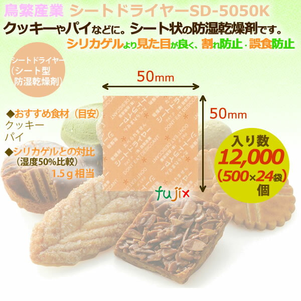 クッキー、パイなどの食品用乾燥剤(鮮度保持)に 商品番号 sd-5050k 商品名 シートドライヤー(シート型乾燥剤)SD-5050K 12000個/ケース 商品説明 シートドライヤーは吸湿性のある基材を両面からフィルムでラミネートしたシート状の防湿乾燥剤です。高い吸湿性能を持っています。また、シートドライヤーは商品の台紙やしおり代わりに使えます。シート状ですので、湿気を取った後も形状変化がほとんどなく、消費者が誤って口にする可能性が低くなります。また、袋状の乾燥剤にある破袋によるトラブルがありません。 シートドライヤーのご使用目安は食品の重さ(g)÷1.5です。 シリカゲルとの対比 (湿度50%比較) 1.5g相当 タイプ シート型乾燥剤 寸法(mm) 50×50 入り数 12000個 使用する商品の目安 クッキー、パイなど 備考 1ケース注文で送料無料 (※北海道・沖縄・離島は送料見積りとなります。)【代引不可】 【同梱不可】 【返品不可】 ※こちらの商品はメーカー直送商品となります。また日時指定は出来かねますので、ご了承くださいませ。 注意 ●基材は塩化カルシウムが含まれますので、金属に接すると錆が発生させる恐れがあります。腐食性のある金属の接触は避けて下さい。 ●高温多湿な環境に放置すると吸湿性能が低下します。これらの場所での保管は避け、開封したら速やかにご使用下さい。開封後に残ったシートはできるだけ空気が少ない状態で、密封して保管して下さい。 関連キーワード クッキー、パイ、食品用乾燥剤、鮮度保持、シリカゲル、シートドライヤー、シート型乾燥剤、ケース、業務用、送料無料●シート型食品用乾燥剤(シートドライヤー)