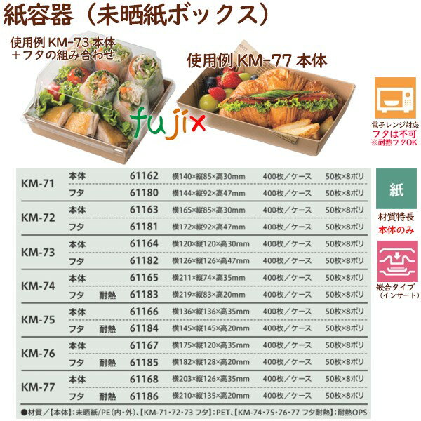 サンドイッチ、サラダ、サイドメニューなどのカジュアルテイストのメニューに最適な紙ボックスで、テイクアウト、持ち帰りにおすすめの環境配慮した、エコな紙容器となります。 未晒紙の紙容器 本体とフタ(別売)で、中身がよく見える惣菜入れや総菜パンなど、持ち帰りやテイクアウト用にも。 ●電子レンジOK ●嵌合タイプ(インサート) ●紙 材質:紙/PE サイズ(mm):縦:203×横:126×高さ:35 入数:400個(50個×8袋)/ケース 1ケースで送料無料 ※ただし、北海道、沖縄、離島除く 【個人宅配送不可】【返品交換不可】 ◆組み合わせ商品◆ 【フタ】KM-77耐熱フタ 未晒紙ボックス ◆関連商品◆ KM-71本体 KM-72本体 KM-73本体 KM-74本体 KM-75本体 KM-76本体 KM-77本体未晒紙ボックス KM-77本体