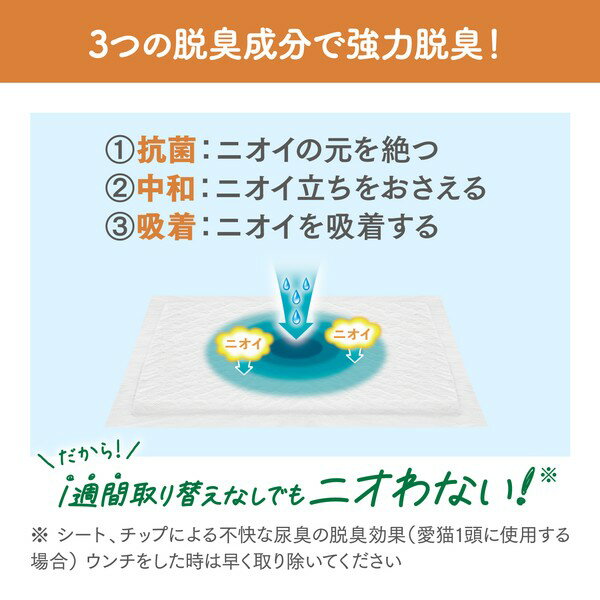 ニャンとも清潔トイレ 脱臭・抗菌シート 商品説明 特長:・オシッコの色がわかりやすい白色シート 表面が白くオシッコの 色がわかりやすいので、 健康チェックが簡単にできます。 ・パワフル吸収で1週間取り替え不要※1 1枚で1週間分のオシッコをパワフルに吸収して閉じ込めます。※1 週1回の交換で お手入れラクラク。 ・1週間ず〜っとニオわない!※2 秘密は「3つの脱臭パワー」 抗菌※3脱臭:二オイの元を絶つ 中和脱臭:ニオイ立ちをおさえる 吸着脱臭:二オイを吸着し閉じ込める抗菌※3効果でツンとくるアンモニア臭もカットします。 ※1 愛猫1頭に使用する場合 ※2 ●チップ、シートによる不快な尿臭の脱臭効果(愛猫1頭に使用する場合) ●ウンチをしたときは早く取り除いてください ※3 すべての菌の増殖を抑制するわけではありません 用途:猫システムトイレ用シート 成分:素材:ポリオレフィン不織布、綿状パルプ、吸水紙、高分子吸収材、ポリエチレンフィルム、ホットメルト接着剤、抗菌剤、中和消臭剤、吸着消臭剤 内容量:8枚×8袋/ケース 1ケースで送料無料 ※ただし、北海道、沖縄、離島除く 【返品交換不可】【お取り寄せ商品】 寸法:大きさ(外寸):約45cm × 約35cm ニャンとも快適システム 愛猫も私もうれしい!チップとシートで 「ダブル脱臭&抗菌※3」 脱臭・抗菌チップ オシッコで固まらない天然素材のチップが、ウンチ・オシッコのニオイをしっかり閉じ込める スノコ面が広いので、端っこにしたオシッコも残りにくい 脱臭・抗菌シート※4 1週間分のオシッコのニオイを、シートがパワフルに吸収するから、1週間取り替えなしでもニオわない!※1 ニャンとも清潔トイレは、専用の「トイレ本体」、「脱臭・抗菌チップ」、「脱臭・抗菌シート※4」の3つをセットで使います。 ※1 ●チップ、シートによる不快な尿臭の脱臭効果(愛猫1頭に使用する場合) ●ウンチをしたときは早く取り除いてください ※4 吸収体には、ニャンとも清潔トイレ専用の「脱臭・抗菌マット」もお使いいただけます ミシン目にそって開けてください 交換方法 引き出し付きタイプの場合 ●尿がこぼれる場合があるので、新聞紙の上など、汚れてもかまわない場所で行ってください。 ●「ニャンとも清潔トイレ」の印刷がある面を下にして敷いてください。 ●中の吸収体がかたよることがあるので、シートを振り広げないでください。 ●シートを切ると吸収体の粉が飛び散るので、切らずにお使いください。 引き出しを開け、使用済みシートを取り出してください。 シートの四隅を引き出しに合わせ、 フチを立てて、しわが寄らないように敷いてください。 シートがずれないよう、引き出しをゆっくり閉めてください。勢いよく閉めると、シートがずれ、尿がもれる原因になります。 使用後の処理方法 ・本品は水に溶けないので水洗トイレに流さないでください。 ・本品は燃えるごみとして処理できますが、自治体により廃棄物の分類が異なる場合があるので、お住まいの地域のルールに従ってください。 シート使用期間の目安 愛猫1頭の場合 1枚で約1週間 愛猫2頭の場合 1枚で約3〜4日間 愛猫の尿量は、体重や季節、年齢等によって変化します。尿量が多い場合は、シートが吸収しきれなくなることがあるので、早めに交換してください。 「ニャンとも清潔トイレ」の専用トイレと一緒にお使いください ・本品は食べ物ではありません。お子さまや認知症の方などの誤食にご注意ください。 ・万一、飲み込んだり、食べてしまった場合は、医師や獣医師にご相談ください。 ・思わぬトラブルを避けるために、お子さまや認知症の方などの手の届かない場所に保管してください。 ・用途以外には使わないでください。 ・開封後は、湿気の少ない風通しの良い場所に保管してください。 ご使用前に必ずお読みください。 「ニャンとも清潔トイレ」のトイレ本体には、必ず専用のチップ、シート(またはマット)をお使いください。 ご注意 *他の吸収シート等を使うとサイズが合わず、 脱臭・吸収効果が充分発揮されないばかりか、尿もれなど、トラブルの原因となる恐れがあります。 ◆商品の問い合わせ先◆ フジックス株式会社 mail:fujix@coast.ocn.ne.jp TEL06-6762-3661 電話受付時間:13時〜17時9(月・休み明け翌営業日) 9時〜17時(火〜金)