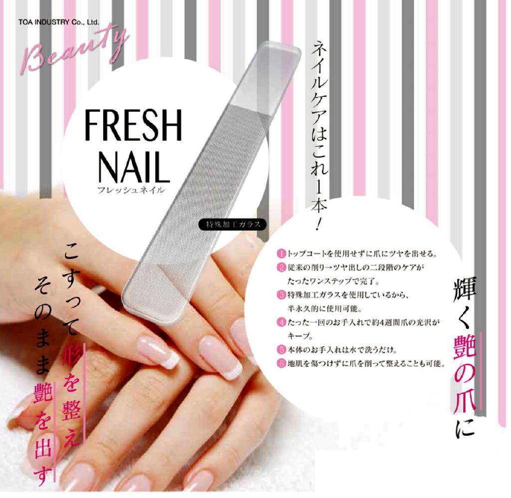 メール便発送商品(全国送料無料)※こちらの商品はメール便にて「ポスト投函」でのお届けになります。※代金引換はご利用いただけません。※お届け日時のご指定はできません。※宅配便送料別の商品と同梱の場合、宅配便の送料となります。※通常、出荷後1〜4日程度でのお届けとなります。※荷物問合せ番号よりお荷物の追跡が可能です。●ネイルケアはこれ1本!こすって形を整えそのまま艶を出す●【製品特長】●トップコートを使用せずに爪にツヤを出せる。●従来の削り→ツヤ出しの二段階のケアがたったワンステップで完了。●特殊ガラスを使用しているから、半永久的に使用可能。●たった一回のお手入れで約4週間爪の光沢がキープ。●本体のお手入れは水で洗うだけ。●地肌を傷つけず爪を削って整えることも可能。●商品名:フレッシュネイル●材質:ガラス●サイズ(約)90×13×2.8mm品番:905048、JAN:4562441905048