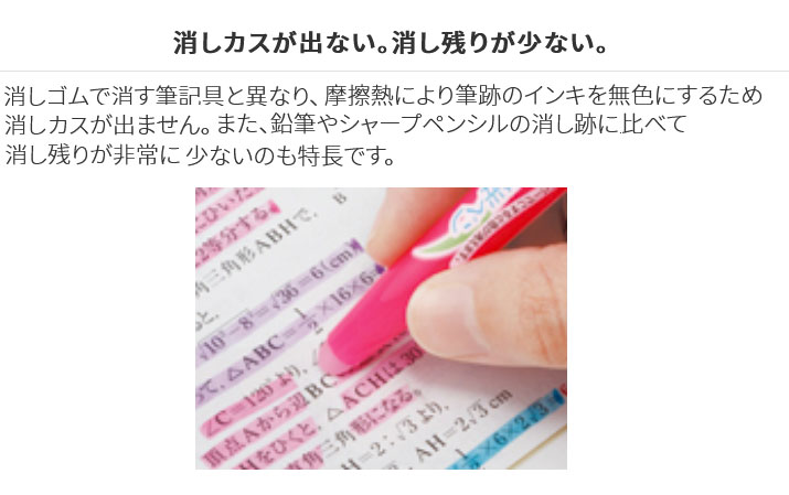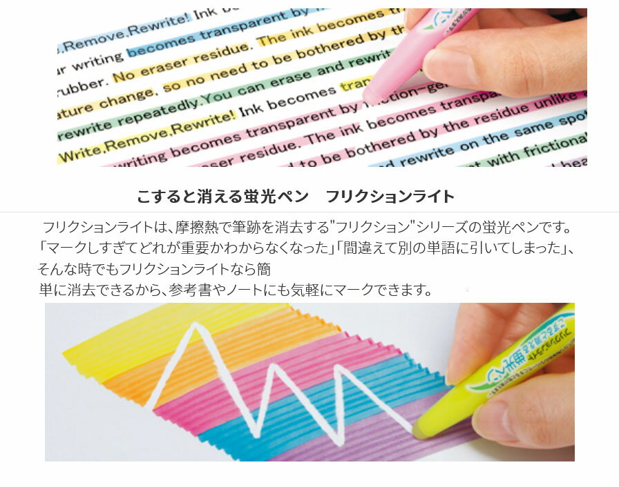 【製品の特徴】○こすると消える蛍光ペン フリクションライト・フリクションライトは、摩擦熱で筆跡を消去する"フリクション"シリーズの蛍光ペンです。「マークしすぎてどれが重要かわからなくなった」「間違えて別の単語に引いてしまった」、そんな時でもフリクションライトなら簡単に消去できるから、参考書やノートにも気軽にマークできます。○新開発の「蛍光フリクションインキ」搭載・蛍光色素を用いた新開発の「蛍光フリクションインキ」を搭載。このインキは、ボディ後部の専用ラバーで擦ることで発生する摩擦熱により消色設定温度に達し、インキの色が無色に変わり、筆跡を消すことができます。○消しカスが出ない。消し残りが少ない。・消しゴムで消す筆記具と異なり、摩擦熱により筆跡のインキを無色にするため、消しカスが出ません。また、鉛筆やシャープペンシルの消し跡に比べて消し残りが非常に少ないのも特長です。○何度でも書き消し可能です。・消した箇所での繰り返し筆記が可能です。○ふんわり色でキレイが作れる!フリクションライトナチュラルカラー。・ラインマーカーとして使えるナチュラルカラー。手帳や参考書、スタディプランナーなど幅広く使えて便利です。【仕様】・種類:蛍光ペン・サイズ:最大径φ 12.6mm 全長 139mm・インキ:フリクションインキ・方式:キャップ式