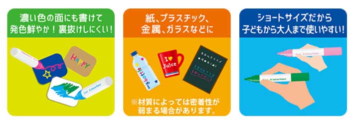 【商品説明】水性顔料インキシリーズ「ジュース」のマーカータイプ。六角形だから、しっかり握れて使いやすい!いろいろなモノに鮮やかに描ける ショートサイズのカラフルマーカー。ジュースペイントは黒い紙のノートやメモ帳「ブラックシリーズ」に対応しています。※ブラックノート対応(無地/パットタイプNFB01-35、ドット罫線/ノートタイプ NFB02-40)【詳細】●サイズ:最大径16.3mm×全長120.3mm●水性顔料インキ●方式:キャップ式(撹拌&ポンピング方式)●ペン先:1.0mm(細字)