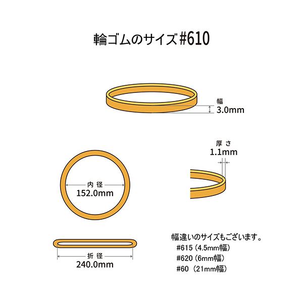 <<ご注意下さい>>こちらの商品はメーカーよりお客様へ直接お届けの品になります。 当店での在庫はしておりません。在庫の有無はメーカー在庫のみになりますので、急な欠品や急に廃盤になる可能性がございます。こちらの商品の配送について こちらの商品につきましてはメーカーより直接お客様へ配送しております。メーカーが使用する運送会社の都合により配送条件が通常の商品と異なりますのでよろしくお願いします。こちらの商品の包装(ラッピング)について○上記の理由(メーカーより直送)により包装はできませんので予めご了承お願いします。こちらの商品の不具合について○お届けしましたこちらの商品に不具合があった場合、商品到着日より1週間以内に当店にご連絡ください。メーカーが直接対応させて頂きます。○お客様がご自身で修理された場合、費用の負担は致しかねますので予めご了承下さい。■商品内容【ご注意事項】この商品は下記内容×3セットでお届けします。結束、包装、縫製などに広範囲に利用でき、作業性、経済性に優れています。●番手#610のゴムバンド、業務用・徳用包装500g。●たくさん使用する、オフィス、作業場、工場などに。●良質の天然ゴムを使用し、菓子のアメに似た色をしているところから、「アメバンド」もしくは「アメ配合」と呼ばれています。■商品スペックサイズ:#610色:アメ内容量:500g切り幅:3mm内径:152mm折径:240mm厚さ:1.1mm材質:天然ゴムその他仕様:●参考平均本数:約330本●推奨結束径:980〜1060mm(1重巻きを想定した参考値)シリーズ名:オーバンド