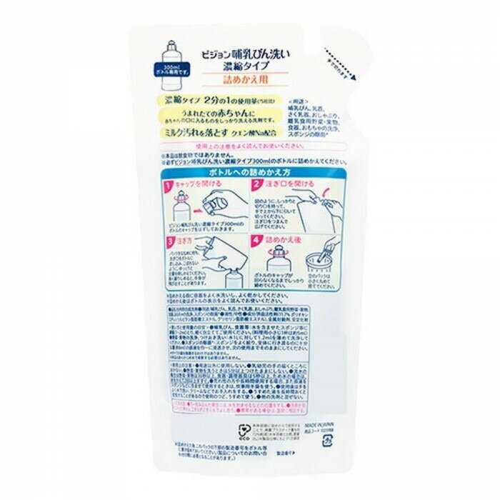 <<ご注意下さい>>こちらの商品はメーカーよりお客様へ直接お届けの品になります。 当店での在庫はしておりません。在庫の有無はメーカー在庫のみになりますので、急な欠品や急に廃盤になる可能性がございます。こちらの商品の配送について○北海道・沖縄・離島につきましては、配送不可となりますので予めご了承お願いします。こちらの商品の包装(ラッピング)について○上記の理由(メーカーより直送)により包装はできませんので予めご了承お願いします。こちらの商品の不具合について○お届けしましたこちらの商品に不具合があった場合、商品到着日より1週間以内に当店にご連絡ください。メーカーが直接対応させて頂きます。○お客様がご自身で修理された場合、費用の負担は致しかねますので予めご了承下さい。うまれたての赤ちゃんにお使いいただけます。100%食品用原料成分使用、頑固なミルク汚れを落とすクエン酸Na配合、無添加(着色料・香料・リン)、野菜も洗えるので離乳期にも大活躍です。長く使えます。※すべての菌を除菌するわけではありません。※本品は飲食物ではありません。※必ずピジョン哺乳びん洗い濃縮タイプ300mlのボトルに詰めかえてください。※用途以外に使用しない。※乳幼児の手の届くところにおかない。※野菜・果物を洗うときは5分以上つけたままにしない。※流水の場合は野菜・果物は30秒以上、食器・調理器具は5秒以上、ため水の場合は、水をかえて2回以上すすぐ。※荒れ性の方や長時間使用する場合、また原液をスポンジなどに含ませて使用するときは、炊事用手袋を使う。※使用後は手をよく水で洗い、クリームなどでお手入れをする。※うすめた液を長時間おくと変質することがあるので使用のつど、うすめて使う。※他の洗剤と混ぜない。※詰めかえた後、このパックの下部の製造番号をボトル等に書き留めておいてください。(製品についてのお問い合わせの際に必要となることがあります。)※本品は、航空法で定める航空危険物に該当しません。※万一飲み込んだ場合には、水を飲ませるなどの処置をする。※洗剤が目に入った場合は、こすらずにすぐ水でよく洗う。※異常がある場合は、医師に相談する。※家庭用消費者製品における成分情報開示に関する自主基準(日本石鹸洗剤工業会)に基づき表示しています。内容量:250mlサイズ:個装サイズ:21.4×11.6×4.5cm重量:個装重量:260g素材・材質:界面活性剤(15%、ポリオキシエチレンソルビタン脂肪酸エステル)、金属封鎖剤、安定化剤機能名称(成分名):基剤(水)、界面活性剤(ポリオキシエチレンソルビタン脂肪酸エステル)、界面活性剤(しょ糖脂肪酸エステル)、界面活性剤(グリセリン脂肪酸エステル)、金属封鎖剤(クエン酸ナトリウム)、安定化剤(エタノール)、安定化剤(安息香酸ナトリウム)、安定化剤(ポリリジン)仕様:無添加:着色料、香料、リン生産国:中国