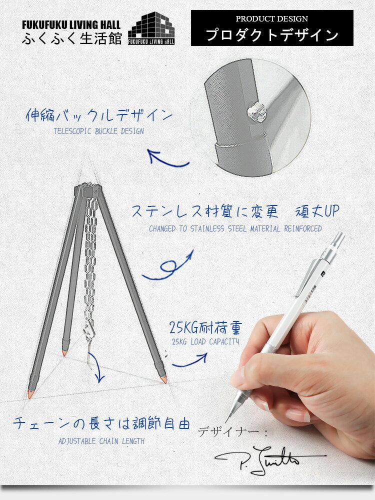 ITEM INFOMATION 商品名| トライポッド カラー| ブラック 素材| ステンレス、アルミ合金 重量| 約1070g 耐荷重| 25kg サイズ| 組立時:117.5cm×93cm 収納時:59cm×13cm 開く角度|40° セット内容| チェーン*1 収納ケース*1 三脚スタンド*1 関連キーワード| 【耐荷重25kg/7段階高さ調節/収納袋付き】トライポッド ファイヤースタンド 超軽量 バーベキュー 焚火スタンド 焚き火用 三脚 ダッチオーブン アウトドアギア ソロ キャンプ 持ち運び 便利 コンパクト ステンレス アルミ 調理器具 取り外し可 防災グッズ クッキング用品 軽量 黒 ブラック おしゃれ ファミリー BBQ 料理design conceptデザイン理念 耐荷重は約25kgです。7段階高さ調節を設計されており、一人でも簡単に設置できます。 ステンレス製、耐摩耗性優れています。トライポッドは高強度アルミニウム合金を採用して、しっかり支えられる、物を吊った時に安定感があります。また、長時間使用することで錆に強く、長期的にも安心して使用できます。 コンパクトで専用の収納袋に収納でき持ち運びラクラク! ダッチオーブンやヤカン、鍋を焚き火に掛ける際に重宝します。他にランタンスタンドなどとしての使用も可能です。 中央に重心をおいたトライアングル構造で安定感は抜群です。三脚を使用して調理の安定性を高め、熱制御を向上させます。ダッチオーブンや大型鍋が吊せる丈夫な三脚!ピンでチェーンの長さを変えるだけで火との距離が調節自由。 キャンプ、トレッキング、登山、釣りなど、アウトドアにおすすめです。非常時にも役立つこと間違いなしです。ピラミッド焚火、囲炉裏テーブルとの組み合わせで吊料理を楽しもう! ITEM INFOMATION 商品名トライポッド カラーブラック 素材ステンレス、アルミ合金 重量約1070g 耐荷重25kg サイズ組立時:117.5cm×93cm収納時:59cm×13cm 開く角度40° セット内容チェーン*1収納ケース*1三脚スタンド*1 関連キーワード【耐荷重25kg/7段階高さ調節/収納袋付き】トライポッド ファイヤースタンド 超軽量 バーベキュー 焚火スタンド 焚き火用 三脚 ダッチオーブン アウトドアギア ソロ キャンプ 持ち運び 便利 コンパクト ステンレス アルミ 調理器具 取り外し可 防災グッズ クッキング用品 軽量 黒 ブラック おしゃれ ファミリー BBQ 料理 備考