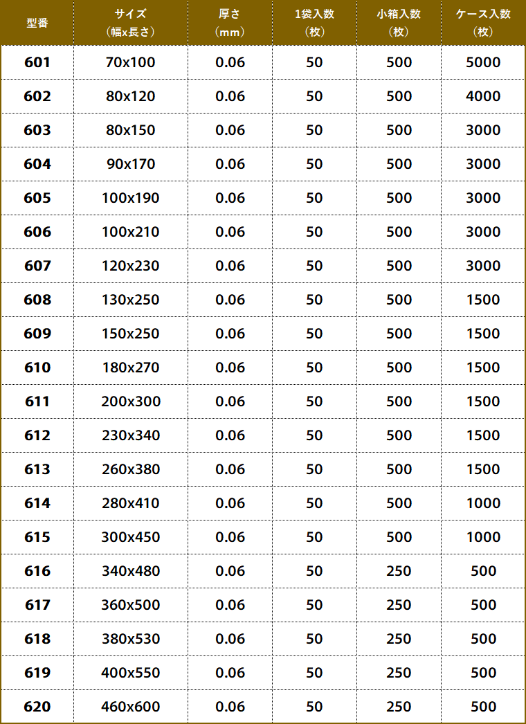 サイズ(mm) No.601:70x100 No.602:80x120 No.603:80x150 No.604:90x170 No.605:100x190 No.606:100x210 No.607:120x230 No.608:130x250 No.609:150x250 No.610:180x270 No.611:200x300 No.612:230x340 No.613:260x380 No.614:280x410 No.615:300x450 No.616:340x480 No.617:360x500 No.618:380x530 No.619:400x550 No.620:460x600 厚さ(mm) 0.06(厚手) 材質 LDPE 入数(袋単位) 50枚入(全20サイズ共通) 入数(小箱単位) No.601〜No.615:500枚入No.616〜No.620:250枚入 入数(ケース単位) No.601:5000枚入 No.602:4000枚入 No.603〜No.607:3000枚入 No.608〜No.613:1500枚入 No.614〜No.615:1000枚入 No.616〜No.620:500枚入 メーカー シモジマ ブランド名 HEIKO(ヘイコー) 特長 様々なシーンで幅広く使っていただける定番の規格ポリ袋です。厚み60ミクロン(0.06mm)としっかりした厚手・厚口のシリーズ。ツルツルした柔らかい素材(LDPE・低密度ポリエチレン)で透明性があり使い勝手の良さが特徴です。0.06mm厚はヘイコーポリの中でも厚手のシリーズ。家電製品の説明書や部品などの梱包用に一般的に使われます。吊り下げ用の紐は付いておりません。取り出し口ミシン目入り。 配送 メール便不可。この商品は原則としてメーカー取寄後宅配便での配送になります。 注意事項 ・この商品はご注文確定後のキャンセルは受付できかねます。また、お客様ご都合によるご返品はお受けできかねます。あらかじめご了承下さい。・当店では複数店舗で在庫を共有しておりますため、また、メーカー取寄となります商品につきましてはメーカーの在庫変動により、ご注文のタイミングにより欠品が生じる場合がございます。廃番等で再入荷時期のご案内ができかねます場合は当店都合としてご注文をキャンセルさせていただく場合がございます。恐れ入りますがあらかじめご了承下さい。 関連商品 ▼規格袋(薄手) ヘイコーポリ 0.015mm厚 スワンポリ 0.02mm厚 スワンポリ 0.02mm厚(ひも付き) スワンポリ 0.025mm厚 スワンポリ 0.025mm厚(青色) ▼規格袋(標準厚) スワンポリ 0.03mm厚 ヘイコーポリ 0.03mm厚(穴あり) スワンポリ 0.03mm厚(ひも付き) ▼規格袋(厚手) ヘイコーポリ 0.04mm厚 スワンポリ 0.05mm厚 ヘイコーポリ 0.06mm厚 ヘイコーポリ 0.08mm厚