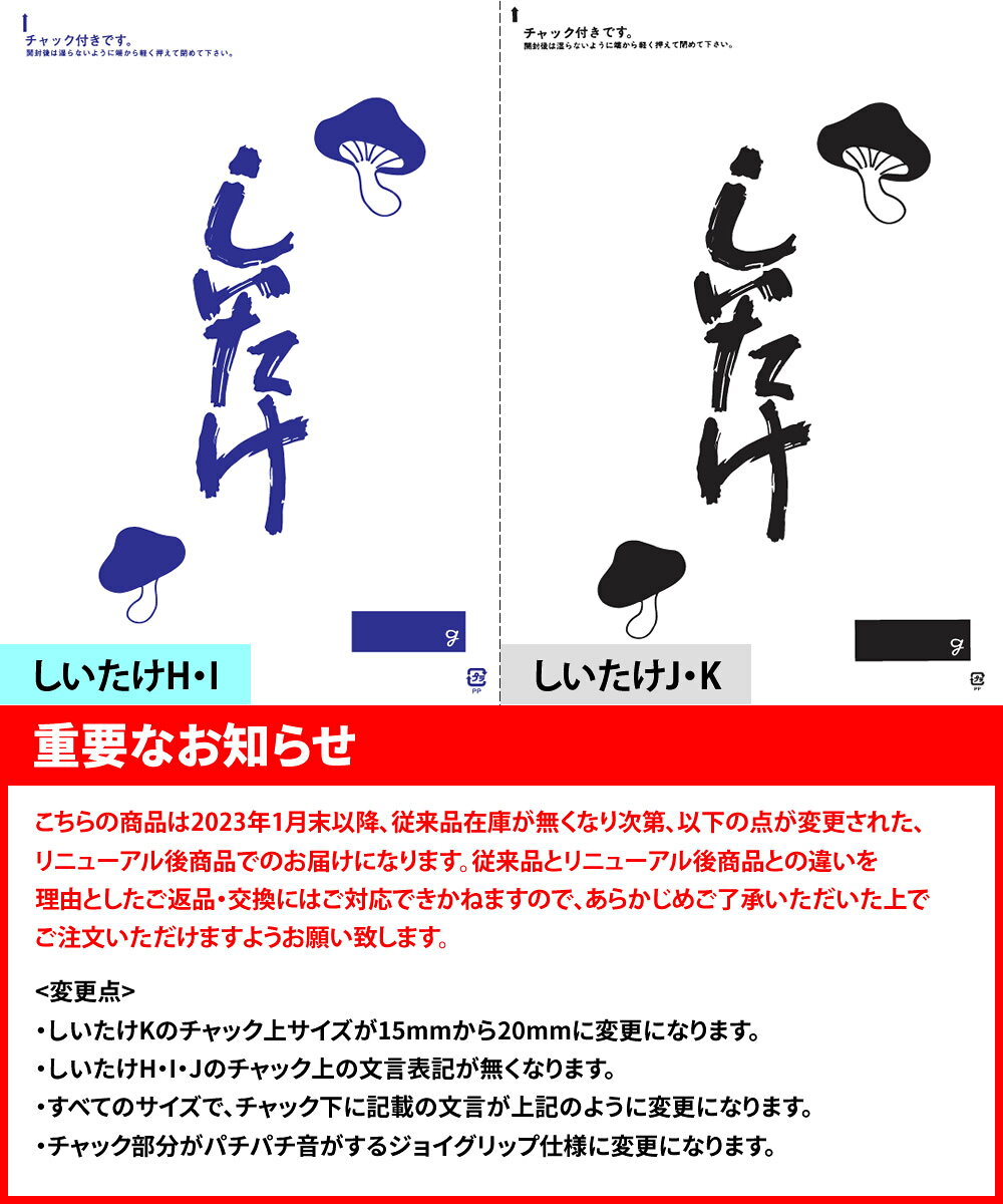 型番 しいたけJ サイズ(mm) チャック下340x袋幅240 厚さ(mm) 0.04 入数 100枚 チャック色 黄 概算重量(g/枚) 6.84 構成 ポリプロピレン単層 メーカー 生産日本社 特長 ・使って便利なしいたけ専用袋・内容量を記入できる白べた印刷付き。・防湿性に優れています。・乾燥剤の使用可。・透明性に優れています・チャック色着色でサイズ判別が可能・1枚ずつすべてに容器包装識別マーク(プラマーク)入 用途 農産加工品(生椎茸・乾燥椎茸) 配送 この商品は原則的にメーカー直送になります。他の商品を同時に ご注文の場合、すべて揃ってからの一括出荷になります。分割発送をご希望の場合はそれぞれ別にご注文手続きいただけますようお願い致します。 注意事項 この商品はご注文確定後のキャンセルは受付できかねます。また、お客様ご都合によるご返品はお受けできかねます。あらかじめご了承下さい。 こちらの商品は2023年1月末以降、従来品在庫が無くなり次第、以下の点が変更された、リニューアル後商品でのお届けになります。従来品とリニューアル後商品との違いを理由としたご返品・交換にはご対応できかねますので、あらかじめご了承いただいた上でご注文いただけますようお願い致します。 【変更点】 ・しいたけKのチャック上サイズが15mmから20mmに変更になります。 ・しいたけH・I・Jのチャック上の文言表記が無くなります。 ・すべてのサイズで、チャック下に記載の文言が上記のように変更になります。 ・チャック部分がパチパチ音がするジョイグリップ仕様に変更になります。 他サイズ しいたけH(240x170mm) しいたけI(280x200mm) しいたけJ(340x240mm) しいたけK(400x280mm) 【ケース単位】しいたけH(240x170mm) 【ケース単位】しいたけI(280x200mm) 【ケース単位】しいたけJ(340x240mm) 【ケース単位】しいたけK(400x280mm) 関連商品 食品用袋はこちらチャック付き袋はこちら