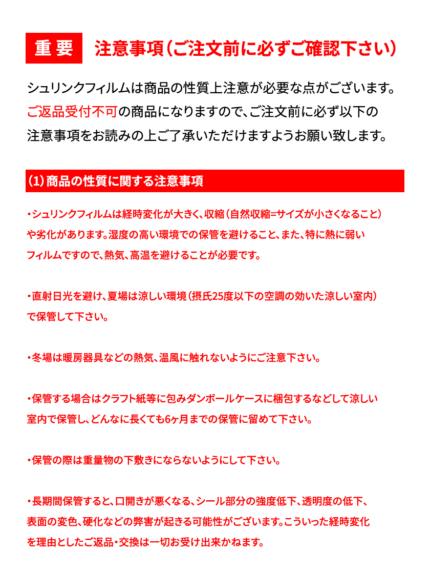 サイズ 幅約280×長さ約430mm 厚さ 0.03mm 穴数 0 材質 ポリ塩化ビニール(PVC) 入数 500枚 用途 スニーカー等 特長 ・シュリンクフィルムは熱で収縮するフィルムです。古書やCD、DVD、ゲームソフト等を包装するのによく利用されています。 ・紫外線防止フィルム製品の紫外線カット率は約90%。大切な包装物を紫外線から保護し、紫外線が原因の劣化や退色等を防ぐ効果があります。 ・シュリンクフィルム袋の中に商品を入れ、プラジェット(ヒートガン)を使って熱風を当てれば簡単に収縮し、誰でも簡単に楽しくきれいに包装することができます。 ・シュリンク包装後、袋の破損を防ぐため空気穴が空いています。穴の数や位置は型番により異なります。この袋の穴の数は別項目に記載しています。 ・箱や容器をシュリンク包装する場合にシール線のシワやツノが立つのを抑えるためのRシール加工済です。 ・変形ボトル等複雑な形状の商品でも熱でフィルムが縮んでぴったりと包装できます。シュリンクフィルム包装を行うことで光沢感が増し、きれいに包装できます。また、ゴミや汚れ、傷から商品を保護します。 ・一度破れると元に戻りませんので、新品未開封のアピールになります。 ・大きさの異なる物でも簡単に結束でき、商品を固定するのに利用できます。 配送 ・メール便不可。この商品は原則としてメーカー直送での配送になります。・主に夏期、高温となる時期においては保管や輸送中にシュリンクフィルム製品の経時変化を極力防止するため、土日前の金曜日の出荷は対応できかねます。恐れ入りますがあらかじめご了承下さい。・商品の性質上、商品発送からお届けまでの間にも高温によりシュリンクフィルムの収縮が発生し得ます。クール便等温度管理のある配送は利用しておりません。ご返品・交換はお受けできかねますため、あらかじめご了承の上でご注文手続きいただけますようお願い致します。 注意事項 ・この商品はご注文確定後のキャンセルは受付できかねます。また、お客様ご都合によるご返品はお受けできかねます。あらかじめご了承下さい。・シュリンクフィルム製品は経時変化が大きく、特に温度、湿度の影響を受け自然収縮が発生し、元のサイズより小さく変化することがご注文からお届けまでの間、また、お届け後の保管状態や取り扱い状況により発生しやすい製品になります。このような経時変化による収縮を理由としたご返品、交換にはご対応できかねますので、あらかじめご了承いただいた上でご注文いただきたく、お願い致します。このような商品の特質を忌避される場合はご注文をお控えいただきたく、ご検討の程宜しくお願い致します。 ・当店では複数店舗で在庫を共有しておりますため、また、メーカー取寄ないし直送となります商品につきましてはメーカーの在庫変動により、ご注文のタイミングにより欠品が生じる場合がございます。廃番等で再入荷時期のご案内ができかねます場合は当店都合としてご注文をキャンセルさせていただく場合がございます。恐れ入りますがあらかじめご了承下さい。・一部の画像と動画に登場するシュリンクフィルム袋のサイズはこの商品ページに記載のサイズとは異なります。イメージとしてお考え下さい。 関連商品 シュリンクフィルムヒートガン(熱風機プラジェット)卓上シーラー溶断タイプ