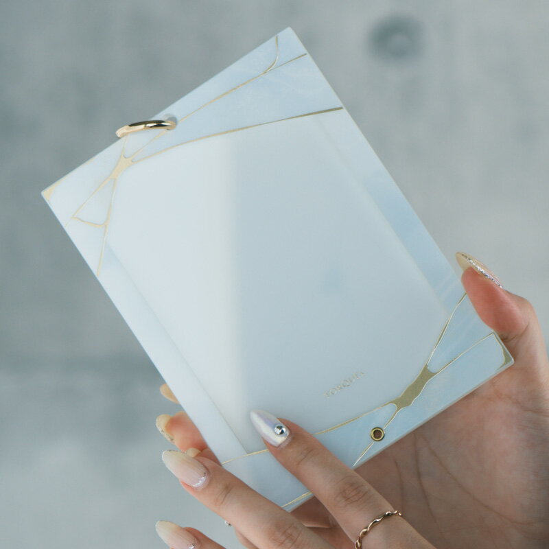 ニュアンスマーブルブロマイドケース 「ニュアンスマーブルブロマイドケース」は金継ぎをイメージしたブロマイドケースです。 日常に馴染むシンプルなデザインに、金継ぎを連想させる箔×樹脂加工を施しました。 ブロマイドなど薄いグッズだけでなく、厚みのあるアクリルグッズも収納いただけます。 カラーはブラック、ホワイトの全2色。 ■商品内容 本体:ブロマイドケース 付属:丸カラビナ ニュアンスマーブルブロマイドケースは3層のアクリルをスライドさせることで、 中にアクリルグッズやカードグッズを飾れるカードケースです 中に入れた飾りパーツやお手持ちのアクリルグッズは、ケース内で固定はされません。 ーーーーーーー 【ご購入にあたってのご注意とお願い】 ●本製品は箔加工と凹凸を出す樹脂加工を施しております。デリケートな加工処理のため、凹凸部分に摩擦や引っ掛かりで衝撃を加えると、加工が取れやすくなっております。ご了承ください。 ●アクリルの印刷面が擦れると素材の特性上、傷が目立ちやすくなっております。ご了承ください。 ●ニュアンスマーブルブロマイドケース、3層目の印刷部分がスライドした際に傷が付くと目立ちやすくなっております。<br> 必ずスライドする際にはアクリルを浮かせて可動させてください。 ●生産時に細心の注意をはらい、可能な限り不良検品を行いお届け致しますが、防ぎ切れない傷や、配送時に傷が発生する可能性がございます。 予めご了承の上ご購入頂きますよう、お願い申し上げます。 ーーーーーーー 商品名 ニュアンスマーブルブロマイドケース 商品説明 ニュアンスマーブルブロマイドケースは、お手持ちのカードグッズ、アクリルグッズを入れて使用するアイテムです。 中に入れた飾りパーツやお手持ちのアクリルグッズは、ケース内で固定はされません。 ※商品画像はサンプルです。本製品は素材特性により、光の反射や写り込みによるシルバー装飾部分に色味に影響がございます。ご了承ください。 ※ディスプレイで見る写真の色合いと、実際の色味は多少見え方で違いがある場合がございますのでご了承ください 商品サイズ <本体サイズ> 約横9.6×縦15.8×厚0.9cm <収納部分内寸サイズ> カードサイズ:約横8.0×縦14.2×厚0.3cm 製品素材 アクリル