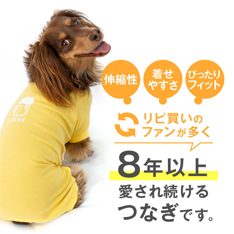 HOME >ダックス・小型犬用 >オールインワン(つなぎ・ロンパース) >袖あり >ベア天竺 ぽっちゃり体型でもしっかりフィット。 驚くほど伸縮性が高く、体にやさしく寄り添います。締めつけ感がなく快適な着心地で、動きやすさも十分に保っています。 豊富なカラー展開とバラエティ豊かなプリントデザインのデイリーにオススメな長袖つなぎ。 ストレッチ性に優れたベア天竺で動きやすく 10年以上多くのリピーターに愛され続ける商品です。 抜け毛や舐め対策にも役立つケアウエアで、リラックスタイムにもオススメ。 不定期に新しいプリントデザインが追加されるのでお好みの色・柄を楽しんでください。 ●本体:40ベア天竺(綿94%・ポリウレタン6%) ●日本製:MADE IN JAPAN ●伸縮性(5段階):5 ●厚さ(5段階):2 ●お洗濯について:手洗い又は、洗濯ネットを使用。アイロンは、当て布をして中温。 ファスナー・ボタン・面テープがある商品は、しっかり止めた状態で洗濯をしてください 国内の縫製工場と連携して、一つひとつ丁寧に仕上げています。心地よい着心地をお楽しみください。 対象犬種カニンヘン・ミニチュアダックス、ダックスフンド、シーズー、チワワ、パピヨン、ポメラニアン、マルチーズ、トイプードル、ミニチュアシュナウザー、ヨークシャーテリアなど