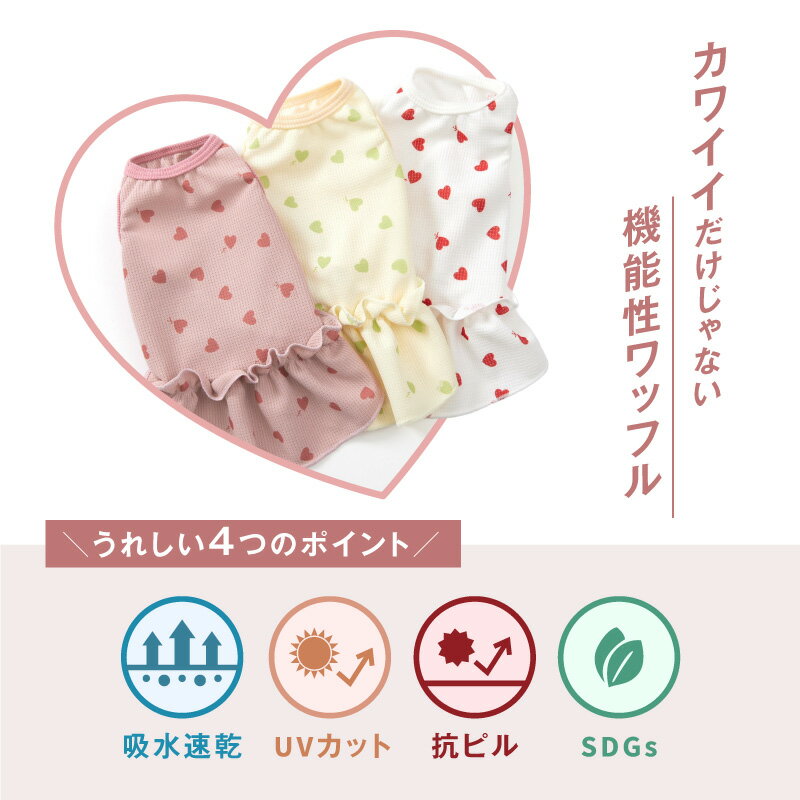 HOME >ダックス・小型犬用 >ワンピース オリジナルハート柄プリントの無敵可愛いワッフルワンピが登場! 綿のように柔らかく、綿よりシワになりにくく乾きやすい。 毛玉ができやすいポリエステル素材でも、抗ピル加工が施されており 毛玉ができにくくお洗濯にも強いお手入れ簡単アイテム。 リサイクルポリエステルを使用した、サスティナブルで柔らかいワッフルです。 ●本体:Re:DryMVS30/-ワッフル(ポリエステル100%) ●部分使い:40スパンテレコ(綿95%・ポリウレタン5%) ●日本製:MADE IN JAPAN ●伸縮性(5段階):3 ●厚さ(5段階):2 ●お洗濯について:手洗い又は、洗濯ネットを使用。ファスナー・ボタン・面テープがある商品は、しっかり止めた状態で洗濯をしてください アイロン・乾燥機は使用しないでください。 ハート柄のプリントは高温で気化したインクを生地に染み込ませる方法であるため、高温多湿での取り扱いにはご注意ください。 プリントの色褪せの原因となります。 日陰吊り干しをおすすめします。 国内の縫製工場と連携して、一つひとつ丁寧に仕上げています。心地よい着心地をお楽しみください。 コレクション:【2025年春夏新作】 対象犬種カニンヘン・ミニチュアダックス、ダックスフンド、シーズー、チワワ、パピヨン、ポメラニアン、マルチーズ、トイプードル、ミニチュアシュナウザー、ヨークシャーテリアなど