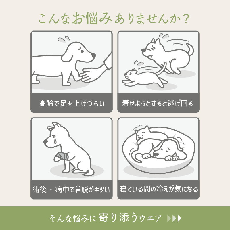 HOME >ダックス・小型犬用 >トップス(タンク・パーカー・スリーパーなど) >袖なし 飼い主さんにも愛犬・愛猫にもやさしい設計のウェア 背中がフルオープンになっているので、関節や筋肉に負担をかけずに、簡単に着せたり脱がせたりできます。 シニアや療養中のケアに適しており、頭を通すのが苦手な子にもストレスなく使えるのが魅力。また、パピーの初めての服としても気軽に取り入れやすい一着です。 ぬくもりを着る、やさしさ仕立てのフルオープンスリーパー。 寒暖差が多い季節、体温調整が苦手な子やシニアにも。 防寒・冷房対策に使えるスリーパーは着脱しやすいフルオープン仕様で洋服が苦手な子にもオススメです。 柔らかくふっくらとしたキルトは、軽量素材で肌にも地球にもやさしいサスティナブルなオーガニックコットンを使用。 皮膚の敏感なワンちゃんの体をやさしく包み、快適なおうち時間を。 ●本体:オーコットキルト(綿80%・ポリエステル20%) ●部分使い:40スパンテレコ(綿95%・ポリウレタン5%) ●日本製:MADE IN JAPAN ●伸縮性(5段階):3 ●厚さ(5段階):3 ●お洗濯について:手洗い又は、洗濯ネットを使用。当て布をして中温。ファスナー・ボタン・面テープがある商品は、しっかり止めた状態で洗濯をしてください。 国内の縫製工場と連携して、一つひとつ丁寧に仕上げています。心地よい着心地をお楽しみください。 コレクション:【2025年秋冬新作】 対象犬種:カニンヘン・ミニチュアダックス、ダックスフンド、シーズー、チワワ、パピヨン、ポメラニアン、マルチーズ、トイプードル、ミニチュアシュナウザー、ヨークシャーテリアなど
