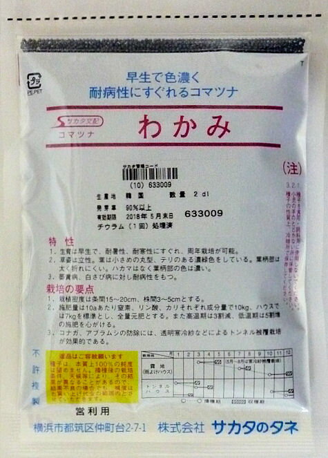 【特性】●生育は早生で、耐暑性、耐寒性にすぐれ周年栽培が可能です。●草姿は極立性で、葉はやや小さめの丸型、テリのある濃緑色です。葉柄部は太く折れにくいです。ハカマはなく、葉柄部の色は濃いです。●萎黄病、白さび病に対し、高度な耐病性を示します。【栽培のポイント】●栽植密度は条間15〜20cm、株間3〜5cmとしてください。●施肥量は10a当りチッソ、リン酸、カリそれぞれ成分量で10kg、ハウスでは7kgを標準とし、全量元肥としてください。●コナガ、アブラムシの防除には、透明寒冷紗などによるトンネル被覆栽培が効果的です。【まきどき】●作型図を目安に、地域や条件に合わせた作型で栽培してください。【商品重量】●約150g 【商品について】 当店は実店舗と在庫を共有しているため、在庫更新のタイミングにより 、在庫切れの場合もあります。 このため、商品の入荷待ちや取り寄せによりお時間をいただく場合があります。 また、メーカー品切れの場合は、やむをえずキャンセルとさせていただく可能性 もあります。 恐れ入りますが、予めご了承のほど、よろしくお願いいたします。