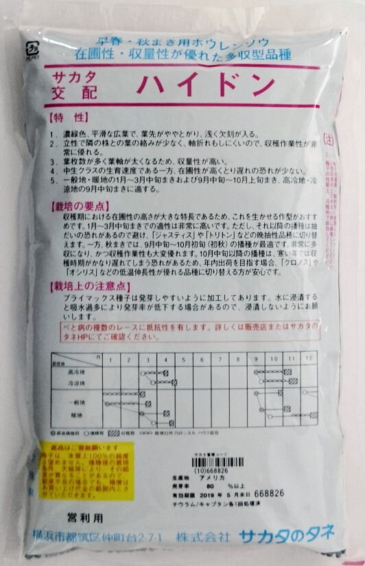 【ホウレンソウべと病について】 近年べと病のレース分化が急速に進んでおります。抵抗性品種の利用により、 べと病の発病を抑えることが可能ですが、いつさらなる新レースが発生してもおかしくない状況なので、 品種の抵抗性だけに頼らず、予防のための薬剤散布など化学的防除や適切な換気など 耕種的防除を組み合わせるように心掛けてください。 【特性】●べと病R-1〜11、13、15、16に抵抗性があります。●濃緑色、平滑な広葉で、葉先がややとがり、浅く欠刻が入ります。●立性で隣の株との葉の絡みが少なく、軸折れもしにくいので、収穫作業性が非常に優れます。●葉枚数が非常に多くなるため、収量性が高いです。●中生クラスの生育速度である一方、在圃性が高く、とり遅れの恐れが少ないです。●一般地・暖地の1〜3月中旬まきおよび9月中旬〜10月上旬まき、高冷地・冷涼地の9月中旬まきに適すします。 【まきどき】作型図を目安に、地域や条件に合わせた作型で栽培してください。 【1袋重量】約470g 【商品について】 当店は実店舗と在庫を共有しているため、在庫更新のタイミングにより 、在庫切れの場合もあります。 このため、商品の入荷待ちや取り寄せによりお時間をいただく場合があります。 また、メーカー品切れの場合は、やむをえずキャンセルとさせていただく可能性 もあります。 恐れ入りますが、予めご了承のほど、よろしくお願いいたします。