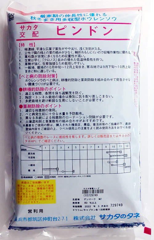 【ホウレンソウべと病について】 近年べと病のレース分化が急速に進んでおります。抵抗性品種の利用により、 べと病の発病を抑えることが可能ですが、いつさらなる新レースが発生してもおかしくない状況なので、 品種の抵抗性だけに頼らず、予防のための薬剤散布など化学的防除や適切な換気など 耕種的防除を組み合わせるように心掛けてください。 【特性】●べと病R1~9、11~16に抵抗性があります。●極濃緑、平滑な広葉で葉先がやや尖り、浅く欠刻が入ります。●立性で隣の株との葉の絡みが少なく、軸折れもしにくいので収穫作業性に優れます。●葉枚数が非常に多くなるため収量性が高いです。●生育は早く、「クロノス」並みの優れた低温伸長性を持ちます。●草勢が強く、生育強健なため栽培しやすいです。●一般地、暖地の10月中旬~12月上旬まき、寒冷地では9月下旬~10月上旬まきに特に適しています。 【まきどき】作型図を目安に、地域や条件に合わせた作型で栽培してください。 【1袋重量】約470g 【商品について】 当店は実店舗と在庫を共有しているため、在庫更新のタイミングにより 、在庫切れの場合もあります。 このため、商品の入荷待ちや取り寄せによりお時間をいただく場合があります。 また、メーカー品切れの場合は、やむをえずキャンセルとさせていただく可能性 もあります。 恐れ入りますが、予めご了承のほど、よろしくお願いいたします。