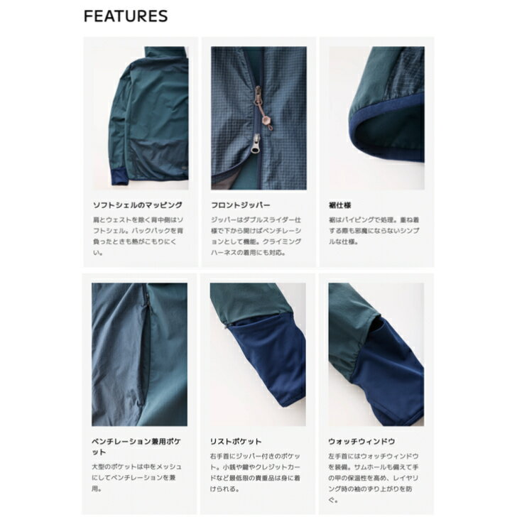 秋冬版ウィンドシェルが新登場秋冬のマウンテンランニングを想定した新作のウィンドシェルです。メインの素材は、通気性とストレッチ性が高く、汗をかいたときも肌離れが良いソフトシェル。冷たい風を受けて生地が肌に触れたときも冷気が伝わりにくい一方で、通気性があるためオーバーヒートもしにくくなっています。肩から前身頃と背中のウェスト部分には、防風性と耐久性に優れるHPPE(ハイパフォーマンスポリエチレン)のリップストップ生地を使用。AERO JACKETと同様、両サイドにベンチレーション兼用の大型ポケット、右手首に小銭や鍵などを入れられるジッパー付きのポケット、左手首にはウォッチウィンドウを備えています。マウンテンランニングだけでなく秋冬の幅広いシチュエーションで重宝するウィンドシェルです。メンテナンス方法柔軟剤・漂白剤は使用しないでください洗濯前に全てのファスナーを閉めてくださいドライクリーニング禁止洗濯後は風通しの良い日陰に干してくださいプリント部分を強く摩擦したり、アイロンがけを行ったりしないでください 5
