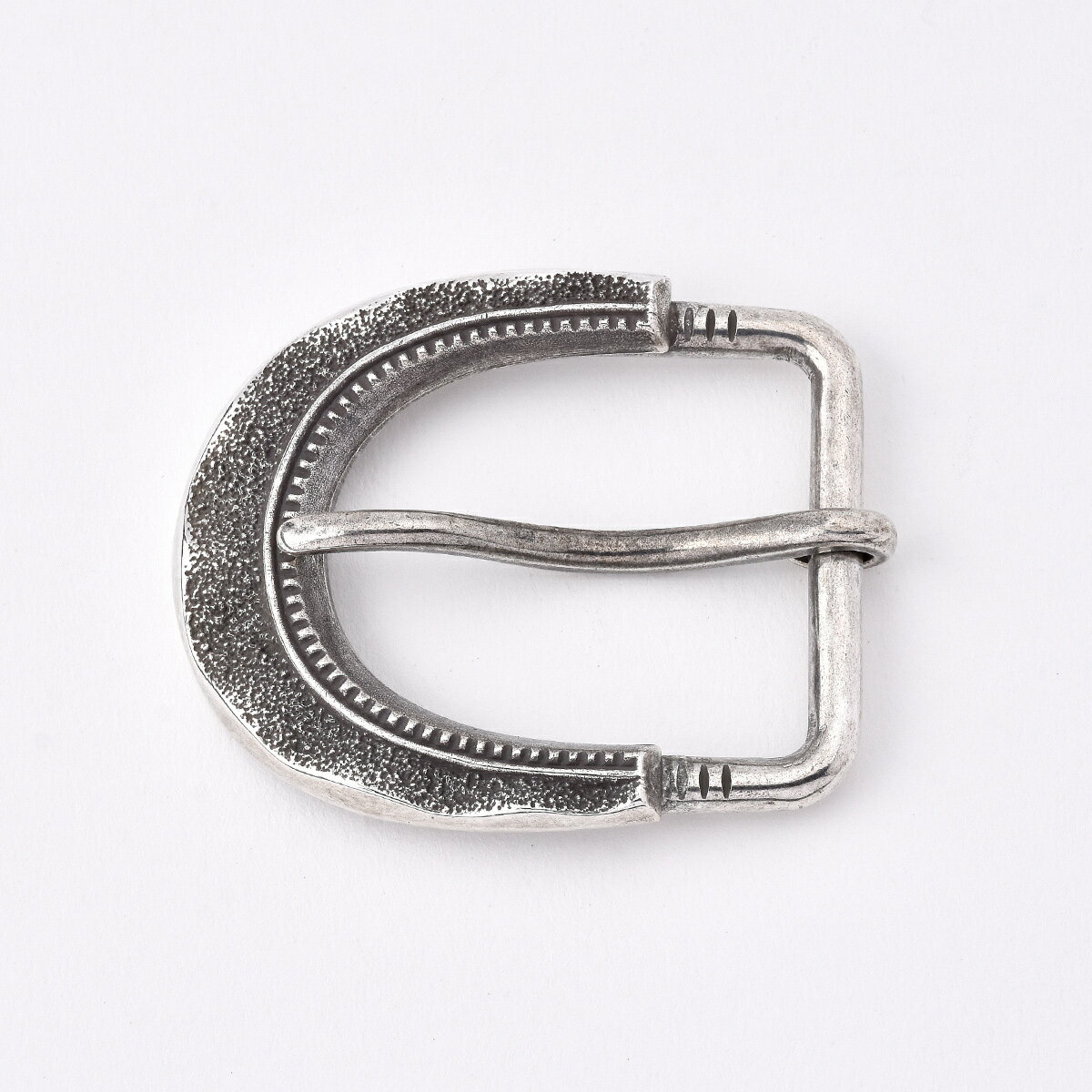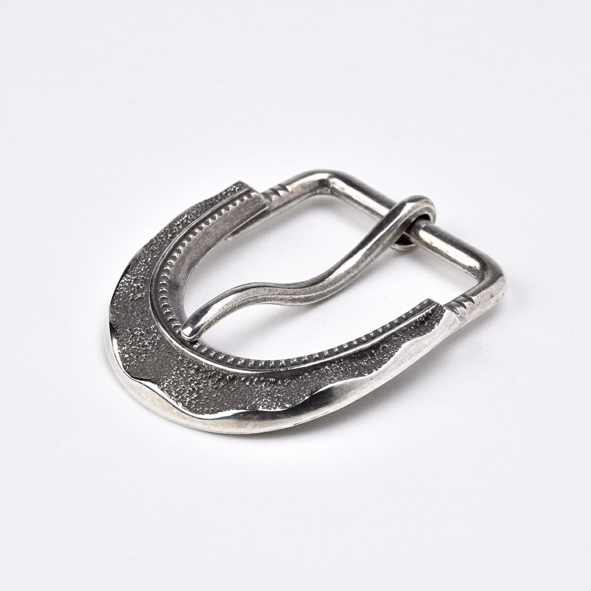 メーカー名 FUNNY ORIGINAL(ファニー オリジナル) 品名 TUFA BUCKLE(トゥファ バックル) 素材ブラス(純銀メッキ/イブシ仕上げ) サイズ 本体:W62 × H54(mm) 装着可能ベルト幅:1.5インチ(38mm) ●バックルの種類によってサイズ感が変わります。装着穴からピンまでの距離が変わるのでベルトを選ぶ際やお持ちのベルトに装着する際にはサイズにご注意ください。詳しくは商品画像をご確認ください。ご不明な場合は当店までお問い合わせください。 ●本製品はイブシ仕上げを施しているため1点1点イブシ具合が異なります。 ●ご使用のブラウザによっては色の見え方が若干異なる場合がございます。 ●当社製品を本来の用途以外にご使用されたり、ご自身での改造等をされた場合、製品本来の性能を損なう恐れがあり、破損・事故等を招く原因にもなりかねませんので、そのようなご使用はお避けください。 ● 純銀メッキを施しているため表面が変色する場合がございます。通常のお手入れは柔らかい布で乾拭きをしてください。シルバークロスで強く擦ったり、研磨剤を使用するとメッキにダメージを及ぼす恐れがございますのでご注意ください。●商品画像に使用しているベルトは装着イメージ用です。バックル単品の販売ですのでご注意ください。個性を際立たせる贅沢な選択肢たちTUFA BUCKLE トゥファ バックル 西部開拓時代に生み出された質実剛健な実用性を重視したベルト&バックルから貴金属を使った装飾性豊かなハリウッドスタイルまで、様々なスタイルのベルト&バックルが生み出されたアメリカンウエスタン・カルチャー。 その楽しみ方を受け継いだFUNNYオリジナルベルトは、バックルを付け替えることを前提にほぼ全てのアイテムがスナップにより着脱可能になっています。 ベルトの印象を変えてくれる個性的なバックルの中からお気に入りの一品を探し、様々なベルトとの組み合わせを楽しんでください。 本アイテムは、ネイティブアメリカンがジュエリー製作に用いるトゥファキャストの技法に着目し、トゥファキャストによって醸し出される雰囲気をデザインによって再現したオリジナルバックルです。 繊細なテクスチャーとユニークな形状でありながらもスッキリとした印象を与えてくれます。 立体的な作りにより、小振りなサイズ感でありながらも重厚な存在感が感じられるバックルに仕上がっており、様々なコーディネートに気負わず取り入れていただけます。