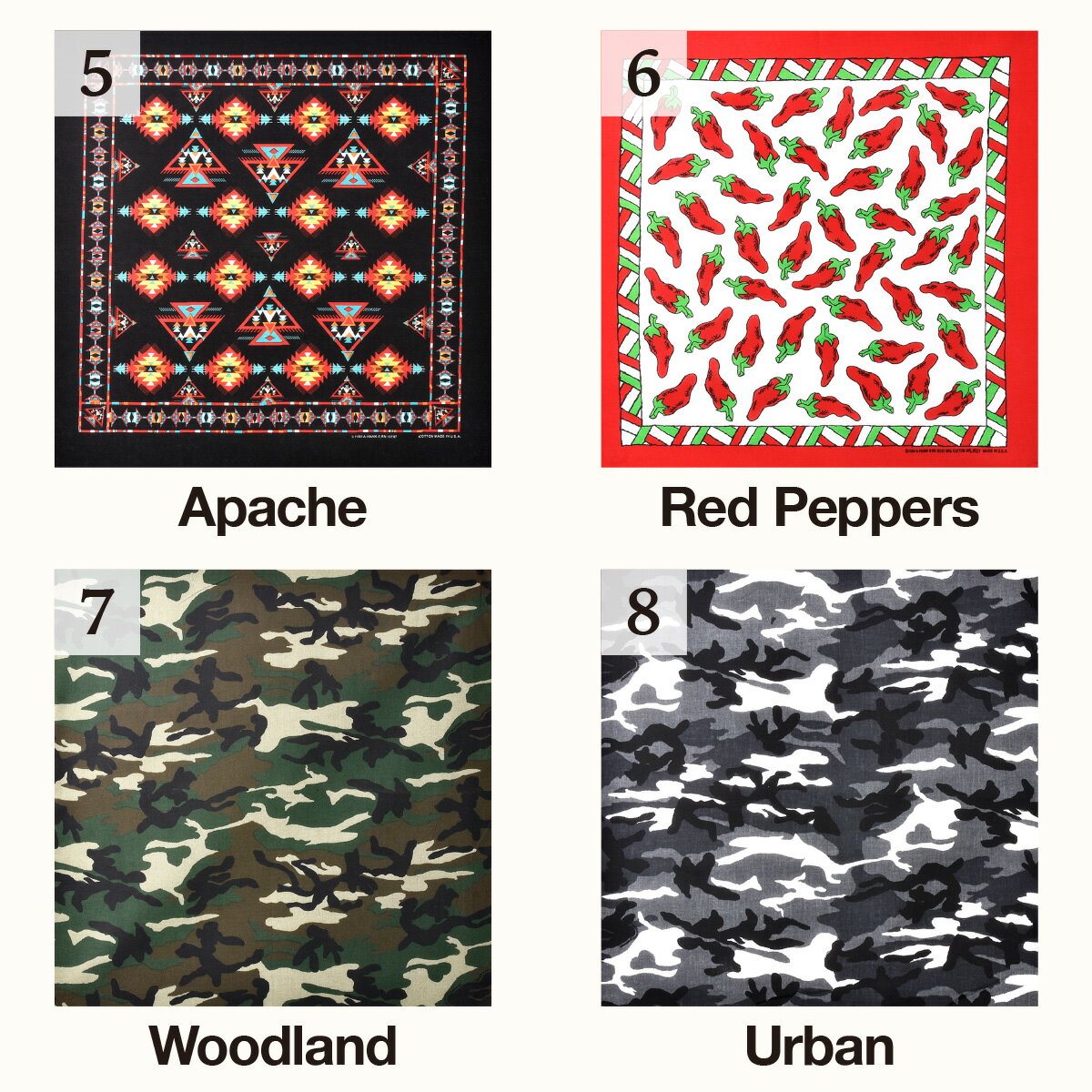 メーカー名HAV-A-HANK(ハバハンク) 品名PATTERN PRINT BANDANA(総柄プリント バンダナ) 素材綿100%No.12:綿95%/ポリエステル5% 【注意】19.Wild Westと17.Buffalo Plaidに見られます「茶色いツブツブ」についてですが、こちらは製品のデザイン上の模様です。予めご了承ください。 サイズ約55cm×55cm ※若干の個体差があります ●ご使用のブラウザによっては色の見え方が若干異なる場合がございますので予めご了承ください。 ●本製品は海外からの輸入商品です。多少のほつれや、プリントのズレ、インクのかすれ、形に歪みが生じる場合がございます。海外製品の特性(品質)として捉え販売しております。返品交換には対応し兼ねますので予めご了承ください。 ●水濡れ・摩擦等により、色落ちが発生するおそれがありますのでご注意ください。色落ちを防ぐ為にも、初めてご使用になる際は一度水通しをしてください。 ●19.Wild Westと17.Buffalo Plaidに見られます「茶色いツブツブ」についてですが、こちらは製品のデザイン上の模様です。予めご了承ください。★メール便★ HAV-A-HANK PATTERN PRINT BANDANA ハバハンク 総柄プリント バンダナ 1947年にアメリカ合衆国サウスカロライナ州で創業された「CAROLINA(カロライナ社)」のバンダナレーベル"HAV-A-HANK(ハバハンク)" アメリカ軍にハンカチとして販売したことがきっかけで始まり、今もなお上質なバンダナを生産し続けています。 確かな品質と抱負な商品数を誇るアメリカ最大のバンダナメーカーです。 ▼まとめ買いがお得!!▼