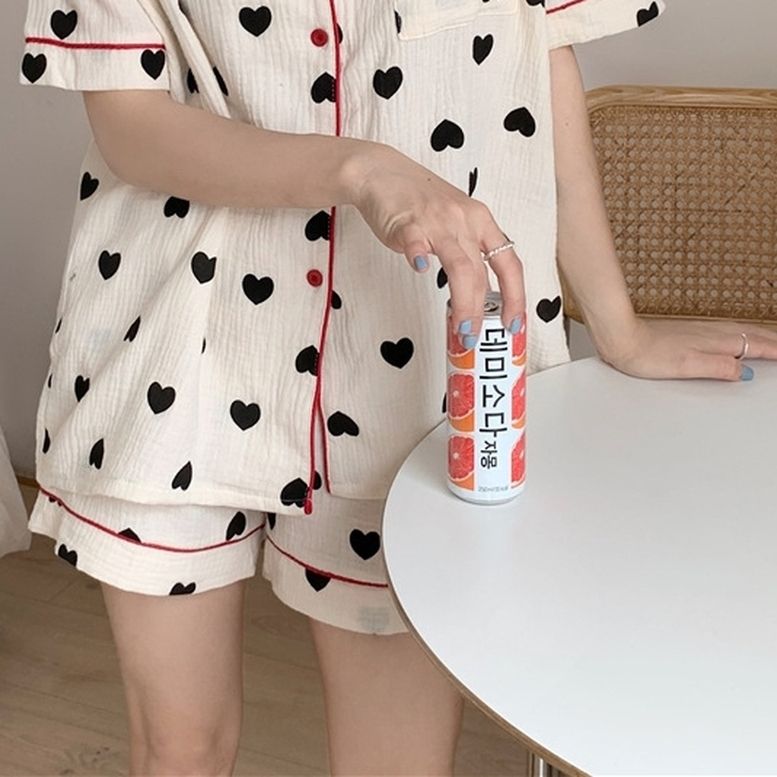 パジャマ 半袖 ルームウェア 部屋着 ボトムス ハート セットアップ コットン ボタン 前開き 上下セット ツーピース リブ 襟付き ショート パンツ ウエストゴム パイピング ホワイト 春 夏 OL 学生 楽ちん ガーリー かわいい 送料無料