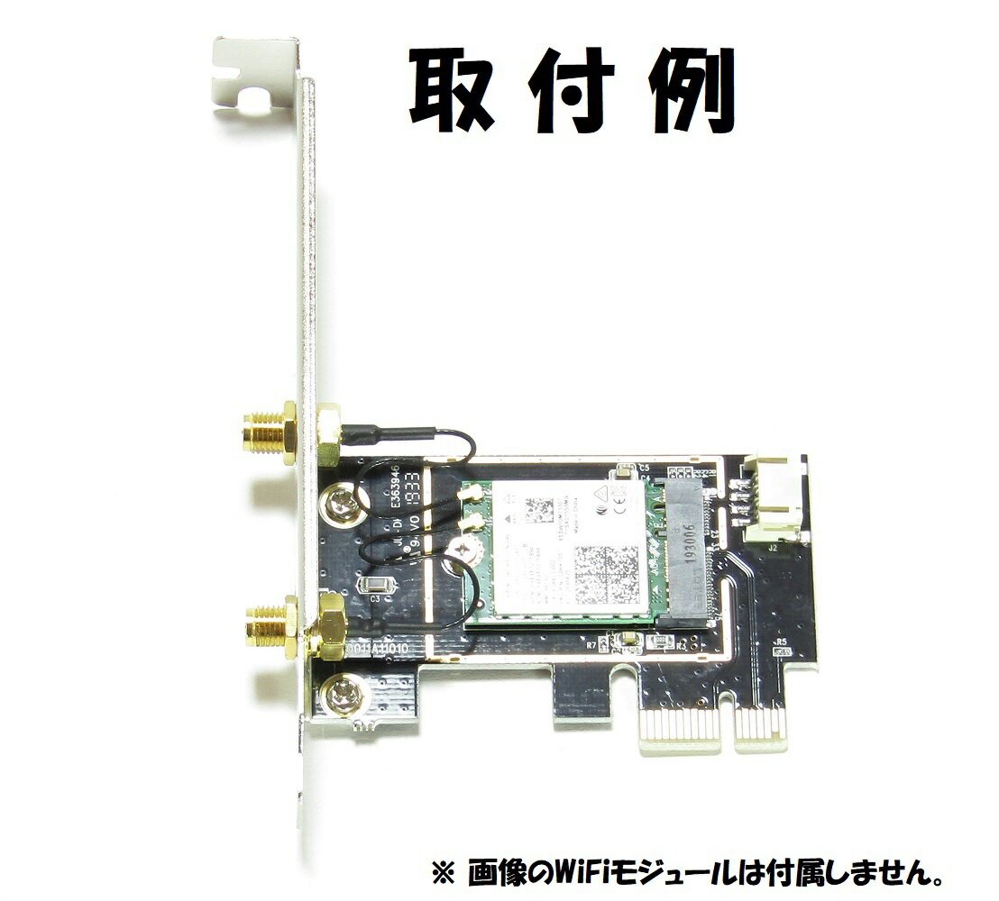 M.2 ngff 用モジュールカード to PCI express変換ボード ・USB接続タイプのBluetoothにも対応 ・m2 NGFFタイプのwifiカードを別途購入してセットすれば、デスクトップパソコンのWiFiを手軽に安価にアップグレードできます。 ・intel AX210NGW, AX200 NGW, 9260 NGW などに対応 ・5.5dbi アンテナ ×2本 付属 ・ブラケットはフルプロファイルブラケットが取付済みです。ロープロファイルブラケットが付属します。 ※この商品はライザーカードです。WiFiアダプターとして動作させるためには別途 intel AX200 NGFFなどの M.2 ソケットタイプのWiFiモジュールが必要です。 ・注意事項:お使いのモニターの発色具合によって、実際のものと色が異なる場合がございます。