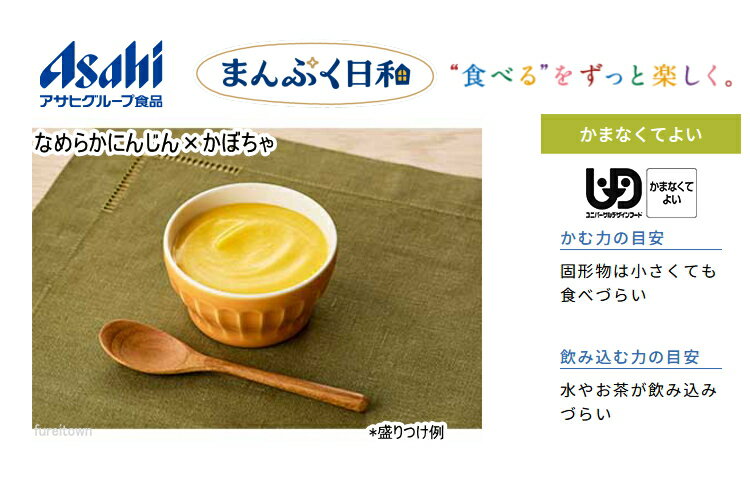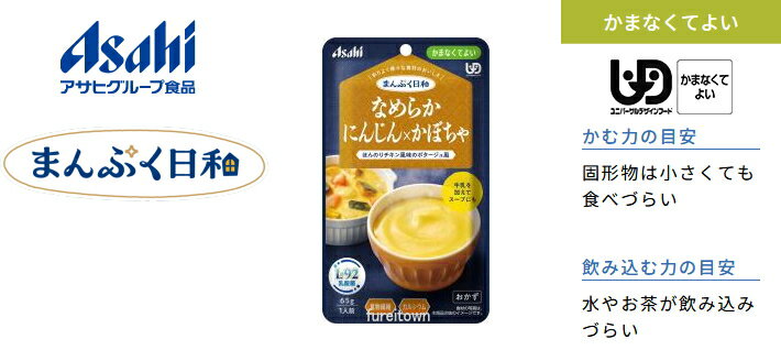 【介護食】 アサヒグループ食品 なめらかにんじん×かぼちゃ / 65g まんぷく日和 にんじんかぼちゃたまねぎを裏ごし、チキン風味のポタージュ風。牛乳を加えてスープに。 食物繊維、カルシウム入り。 区分4 かまなくてよい 副菜 調理済レトルト やわらか食 洋食