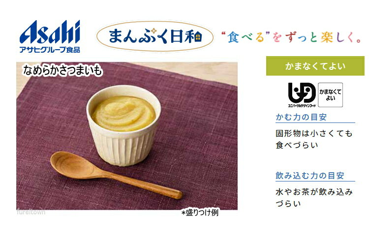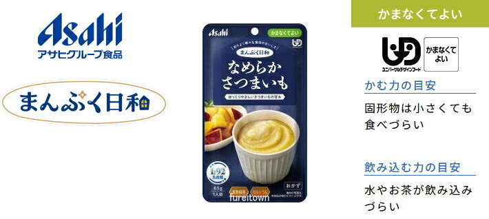 【介護食】 アサヒグループ食品 なめらかさつまいも / 65g まんぷく日和 さつまいもを裏ごした、ほっくりやさしいさつまいもの甘味がある芋きんとん風です。おやつにも。食物繊維、カルシウム入り。 区分4 かまなくてよい 副菜 調理済レトルト やわらか食 和食
