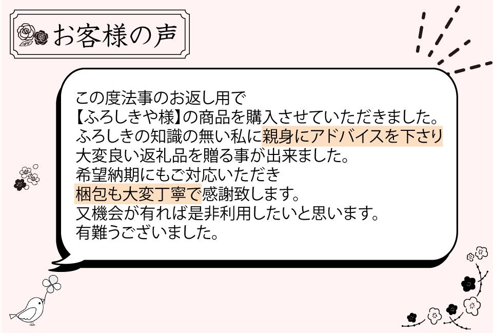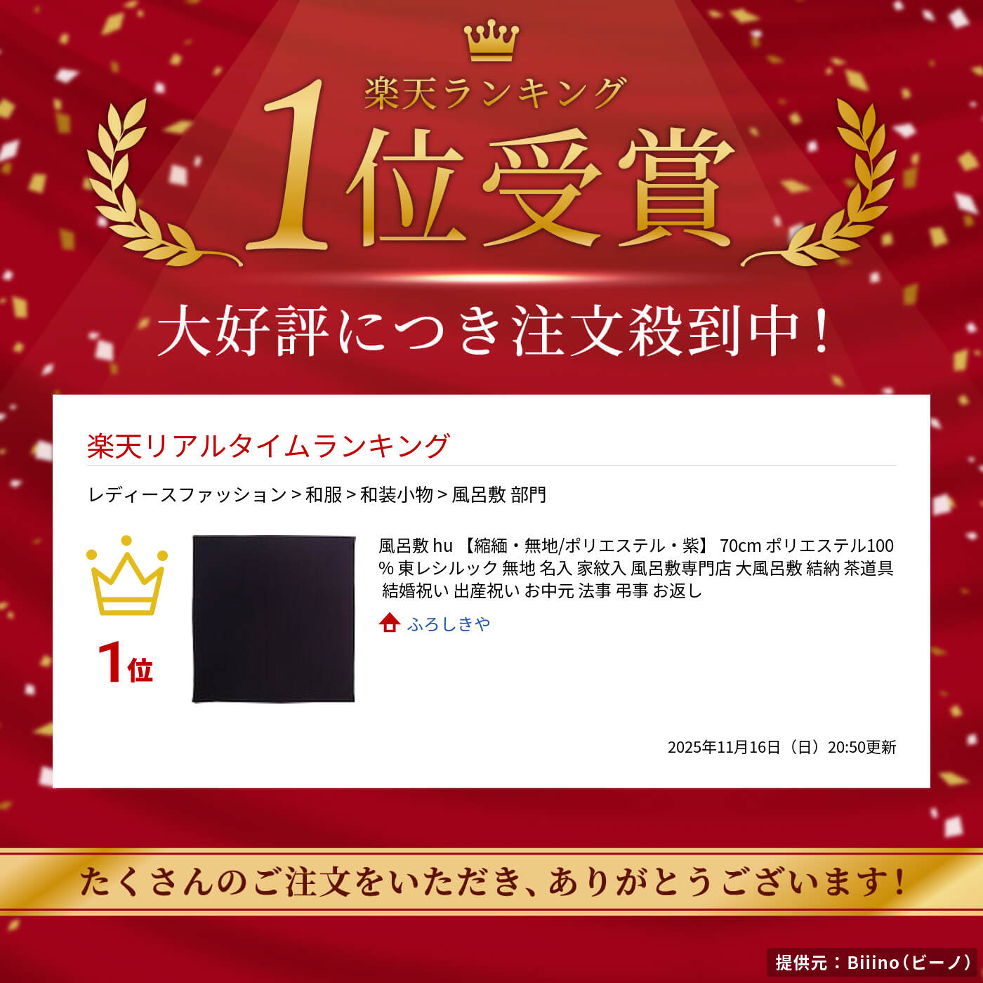 柄のない無地は風呂敷の基本です。無地は風呂敷の中で一番格の高いものになります。慶弔どちらにも「正式」なものとして使えます。記念品やノベルティとしてロゴや社名を入れるのにも最適。贈り物にも喜ばれています。生地にこだわり風合いをお楽しみください。お返しもの、いろいろにお使いいただけます。出産、初節句、七五三、十三詣り、婚礼、銀婚式、金婚式、還暦、古希、喜寿、米寿、白寿、快気、開店、新築、創立、受賞、迎春、中元、歳暮、事始め、供養などに。 叙勲 受賞記念 竣工祝 落慶法要記念 開業記念 創立記念 就職祝 母の日 敬老の日 海外へのおみやげ ■材質 ポリエステル100% ■サイズ 70cm ■重さ 90g 楽天国際配送対象商品(海外配送) 詳細はこちらです 落ち着いた深い紫の縮緬(ちりめん)が上品。 正絹の代用、定番常備品としてお使いください。 【色について】 商品の色はモニターの設定やメーカーの特性によっても、 微妙に違って見える場合がございます。ご了承ください。 2020.3.5販売開始