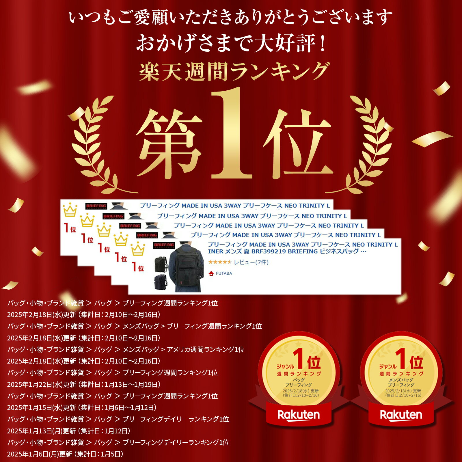 BRIEFING/ブリーフィング/MADE IN USA COLLECTION/NEO TRINITY LINER/ネオトリニティライナー/3WAY/ブリーフケース/ビジネスバッグ/ビジネスリュック/リュックサック/出張/通勤/営業/オフィス/カジュアル/大容量/大きめ/斜め掛け/斜めがけ/肩掛け/肩がけ/ショルダーバッグ/ショルダー/ノートPC/PC/A4/B4/15インチ/12L/ナイロン/バリスティックナイロン/MADE IN USA/メイドインUSA/USA/アメリカ/男性/メンズ/レディース/ブランド/正規品/BRF399219/最強配送 BRIEFING/ブリーフィング/MADE IN USA COLLECTION/NEO TRINITY LINER/ネオトリニティライナー/3WAY/ブリーフケース/ビジネスバッグ/ビジネスバック/ビジネスリュック/リュック/ビジネス/出張/通勤/通勤バッグ/営業/営業バッグ/オフィス/オフィスカジュアル/大容量/大きめ/大きい/斜めがけ/ショルダー/ノートPC/PC/A4/B4/ライナー/15インチ/12L/ナイロン/バリスティックナイロン/made in usa/メイドインUSA/USA/アメリカ/男性/メンズ/レディース/ブランド/30代/40代/50代BRIEFING 1998年にミル・スペックに準拠した真の「ミリタリズム」を追及し、卓越した機能美を持つラゲッジレーベルとして誕生したBRIEFING。 アメリカが本気で生み出す強靱なパーツや最高峰の技術や機能を、タウンユースモデルに落とし込み、それぞれのシーンにフィットするよう研究・開発を進めてきました。ブランド誕生から20年、バッグを通して皆様のライフスタイルに寄り添えるブランドとして進化を続けています。 ブランドページはこちら > BRIEFINGMADE IN USA NEO TRINITY LINER MADE IN USA 1998年にミル・スペックに準拠した真の“ミリタリズム"を追求し,卓越した機能美を持つラゲッジレーベルとして誕生したBRIEFING。 アメリカが本気で生み出す強靭なパーツや最高峰の技術や機能を,タウンユースモデルに落とし込み,それぞれのシーンにフィットするよう研究・開発を進めてきました。 ブランド誕生から20年超えてもなお,ルーツである“MADE IN USA COLLECTION"はトレンドの変化に合わせた進化を続けています。 POINT 01 メインはB4サイズ対応。 POINT 02 15インチPCを収納可能な、クッション材入りのPCスリーブを搭載。 POINT 03 マチを設け収納力抜群のフロントポケット。 さらに内部にポケットを搭載し、小物類の収納に便利。 POINT 04 フロントに配した大きなジップポケットはA4サイズ対応で、書類や新聞などを収納できます。 POINT 05 リュックストラップは背面側に収納が可能で、ブリーフでお使いの際もスマートに。 MATERIAL - 素材 - BRIEFINGが使用しているマテリアルの中で最もヘビーな、強度や耐久性,耐摩耗性に優れた「バリスティックナイロン」を採用。デイリーなヘビーユースにも適しています。 COLOR - カラー展開 - ITEM DETAIL - 商品詳細 - ITEM INFO - 商品仕様 - サイズ 約 W410 x H280 x D120 (mm) ※ サイズは当店計測サイズとなります。 ※ 商品により若干の個体差が生じます。 ※ サイズの表記についてはこちら > 重量 約 1.6kg 素材 1050デニール バリスティックナイロン 仕様 【 メインB4サイズ 12L(ダブルファスナー開閉) 】 ファスナーポケット(A4)、PCスリーブ(クッション材搭載、15インチ程度のPC収納可能) 【 前面 】 ファスナーポケット(A4)×1 マチ付きファスナーポケット(A5)[オープンポケット(A6)×1、メッシュファスナーポケット(B7)×1、着脱式キーホルダー] マチ付きファスナーポケット(B6)×1 【 ハンドル 】 長さ約34cm ※ボタン留めベルト付き 【 ショルダーベルト 】 長さ約85〜133cm ※着脱可能な肩パッド 【 リュックストラップ 】 長さ約64〜107cm 【 付属 】 収納袋 【 JANコード:ブラック 】 4522573050290 BRIEFING このブランドの商品を探す> MADE IN USA メイドインUSA このシリーズの商品を探す>