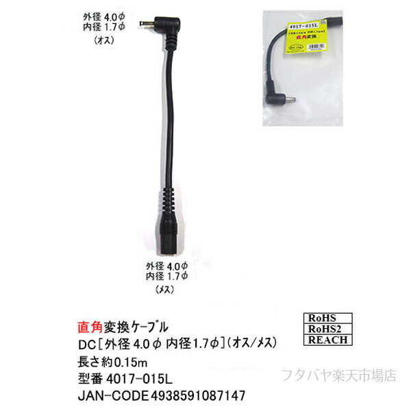 DC電源変換ケーブル(外径4.0mm/内径1.7mm)15cm 外径4.0mm 内径1.7mm(メス)-外径4.0mm 内径1.7mm(オス)直角 最大電力12v/2Aまで対応 COMON(カモン) 4017-015L 長さ:15cm