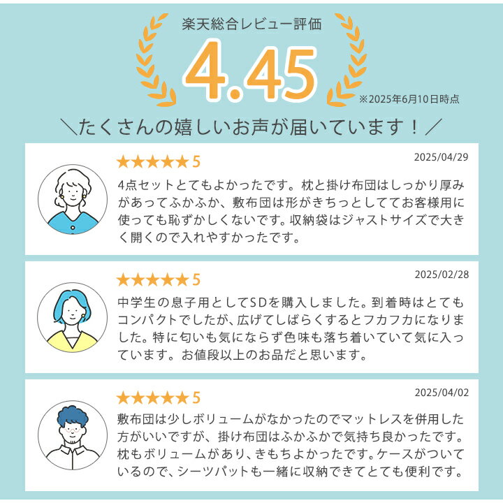 メーカー希望小売価格はメーカーカタログに基づいて掲載しています これ1つで寝具が完成!コスパも寝心地も満足◎ 説明 新生活や来客用にぴったりな、届いてすぐ使えるオールインワンの布団4点セットです。ふかふかの固綿入り敷布団に、軽くて扱いやすい掛け布団、やさしくフィットする枕が揃い、さらに保管や持ち運びに便利な専用収納ケース付き。抗菌・防臭・防カビ加工で衛生面にも配慮しており、掛け布団と枕はご家庭で、敷布団はコインランドリーでC5:C11お洗濯可能。豊富なカラーバリエーションでお部屋のインテリアにもなじみやすく、引っ越しや来客時はもちろん、毎日の睡眠にも快適さをプラスしてくれる、お得で便利な寝具セットです。 サイズ シングル: 掛け布団 約 150 x 210 cm 敷き布団 約 100 x 200 cm まくら 約 43 x 63 cm セミダブル: 掛け布団 約 170 x 210 cm 敷き布団 約 120 x 200 cm まくら 約 43 x 63 cm ダブル: 掛け布団 約 190 x 210 cm 敷き布団 約 140 x 200 cm まくら 約 43 x 63 cm 2個 ・全サイズ布団収納袋付 組成 【掛け布団】 側地:ポリエステル100%,ピーチスキン,抗菌防臭・防カビ加工 中綿:ポリエステル100%/S:1.6kg,SD:1.8kg,D:1.9kg 【敷き布団】 側地:ポリエステル100%,ピーチスキン,抗菌防臭・防カビ加工 中綿:ポリエステル100%,巻きわた1.5kg,固わた1.5kg 3cm SD:巻きわた1.8kg,固わた1.7kg D:巻きわた2.1kg,固わた1.9kg 【枕】 側地:ポリエステル100%,ピーチスキン,抗菌防臭・防カビ加工 中綿:ポリエステル100%,0.55kg ※ダブルは2個 特徴 ・届いてすぐ使えるオールインワン 必要な寝具がすべて揃っているので、届いたその日から快適な睡眠環境が整います。 ・収納ケース付きで保管もラクラク 季節の入れ替えや来客用に便利な専用収納ケース付き。場所をとらずスッキリ収納できます。 ・ふかふか敷布団で床付き感を軽減 固綿入りでしっかりとした厚みがあり、ベッドサイズにちょうどいいサイズ。 ・軽くて扱いやすい掛け布団 ふんわりと暖かく、季節を問わず使いやすい。持ち運びも簡単です。 ・頭にやさしくフィットするふんわり枕 ちょうどよい高さと柔らかさで、首や肩の負担を軽減し快眠をサポート。 ・抗菌・防臭・防カビ加工で衛生的 毎日使うものだからこそ、清潔さにこだわった加工で安心・快適。 ・洗える仕様でいつでも清潔 掛け布団・枕はご家庭で敷布団はコインランドリーで洗えるので、汗や汚れも気にならず、小さなお子様のいるご家庭にも◎。 ・豊富なカラーバリエーション お部屋の雰囲気に合わせて選べる多彩なカラー展開。インテリアにもなじみやすい。 ・お引越し・来客用にも最適 一人暮らしを始める方や急な来客時にもすぐに対応できる便利なセットです。 ・コスパ抜群!高品質なのにお手頃価格 単品で揃えるよりもお得で、品質にも妥協なし。コストを抑えて快適な眠りを手に入れられます。 備考 敷布団を床やベッドフレームに直接敷いても床付きしにくいよう、固綿を中材に使用していますが、体型や寝姿勢によっては床付き感を感じる場合がございます。その場合は、下にマットレスを併用していただくことで、より快適にご使用いただけます。 コインランドリーをご利用の際は、必ず商品ページに記載の洗濯方法に従ってください。誤った方法での洗濯は、生地の破れや穴あきの原因となります。 洗濯の際は必ず洗濯ネットをご使用の上、単独洗いを行ってください。 洗濯ネットを使用せず洗濯しますと破れや穴あきの原因になります。 商品が届きましたら、開封前にご注文の商品と相違がないかの確認を行ってください。 工場で1枚ずつチェック項目に沿って検品・検針をしておりますが、もし開封後に初期不良がありましたら、購入履歴のショップへのお問い合わせよりご連絡をお願いいたします。 洗濯後の不良に関しては、商品に縫い付けてありますお手入れ方法に基づいた洗濯方法を行った場合のみご対応させていただきます。 梱包 環境配慮とお客様の利便性を考慮して、当店は圧縮梱包を行っております。 商品を開封した際は中綿に空気が含まれておらず、薄くなっております。 商品を空気を入れるように揉み解したり、洗濯をすることにより、中綿に空気を含みますので、洗濯をしてからご使用いただくことをお勧めいたします。 ・開封直後は、製造工程上のにおいが感じられる場合がございます。気になる場合は、風通しの良い場所で陰干ししていただくことで、次第に軽減されますのでお試しください。 また、ごみの削減を目指して簡易包装でお届けしておりますので、ラベルなどは付属しておりません。ご了承いただければ幸いです。 検索キーワード 布団セット 4点セット 布団 掛け布団 敷布団 枕 収納袋 組布団 シングル シングルサイズ セミダブル セミダブルサイズ ダブル ダブルサイズ オールシーズン ウォッシャブル 抗菌防臭 清潔 衛生的 防カビ 一人暮らし 引っ越し 嵩張らない おしゃれ かわいい くすみカラー スモーキーカラー 来客用布団 来客用 布団セット 
