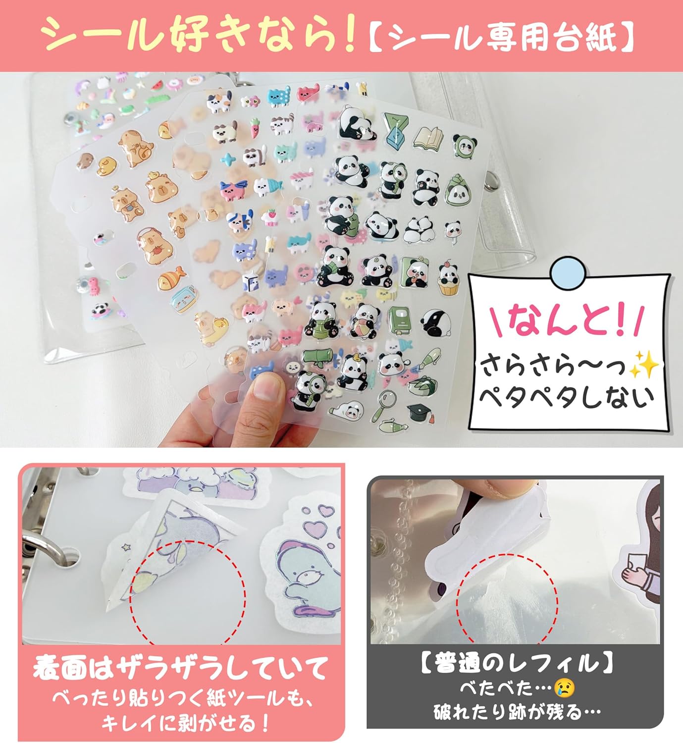 【商品説明】A7/A6/M5サイズのシール帳用シール専用台紙10枚セットです。表面がザラザラしているため、シールを剥がしやすく、厚みと硬さがあるので折れ曲がりにくいのが特徴です。コレクションや交換を楽しむためのシートです。 【セット内容】シール専用のPPシート10枚 【用途】シール集めや交換に最適です。また、ちょっとしたプレゼントにもぴったりです。 ■(自分だけの「見せる」シール帳) 透明な表紙とリフィルが付属しており、シールやカードのコレクションを収納しつつ、そのまま飾ることができます。オリジナルのデコレーションを楽しむことができます。 ■(使いやすいA7/A6/M5サイズ) 手のひらサイズのコンパクトなバインダーで、リフィルの交換や表紙のデコレーションを通じて、自分好みの一冊に仕上げることができます。 ■(軽量で丈夫な耐久性) 柔らかくしなやかな耐水性PVC素材を使用しており、軽量で汚れにくく、毎日の持ち運びに最適です。スナップボタン付きでバッグの中でも開かない設計です。 ■(多様な使い道とアレンジの自由さ) シールやトレーディングカードの収集帳としてだけでなく、スケジュール帳、日記、家計簿、旅のアルバム、メモ帳など、さまざまな用途に活用できます。
