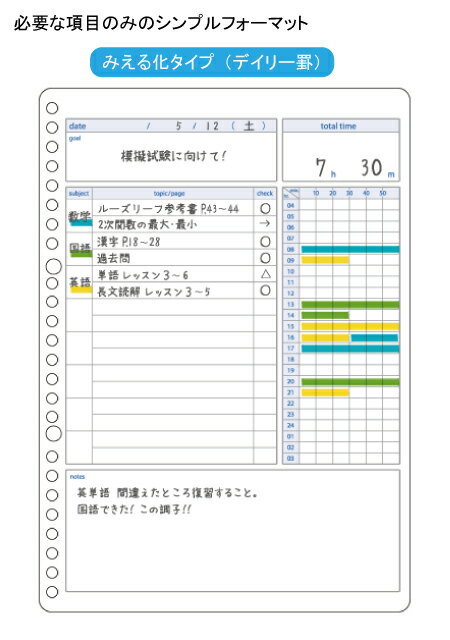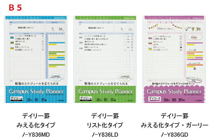 罫内容/商品番号みえる化タイプ /ノ-Y836MD リスト化タイプ /ノ-Y836LD みえる化タイプ・ガーリー /ノ-Y836GDブランドコクヨサイズ(用紙/ノート)B5(257mm×182mm)仕様26穴/30枚紙質上質紙勉強のスケジュールが立てられる「毎日の勉強」のためのキャンパス スタディプランナー裏面はドット罫の中横罫で勉強のまとめが裏面に書ける!