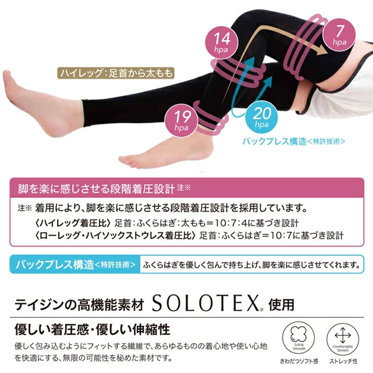脚を楽に感じさせる段階着圧設計 着用により、脚を楽に感じさせる段階着圧設計を採用しています。 (ハイレッグ着圧比) 足首:ふくらはぎ:太もも=10:7:4に基づき設計 (ローレッグ・ハイソックストウレス着圧比) 足首:ふくらはぎ=10:7に基づき設計 素材:レーヨン・ポリエステル・ポリウレタン・ナイロン・絹メーカー希望小売価格はメーカーカタログに基づいて掲載しています
