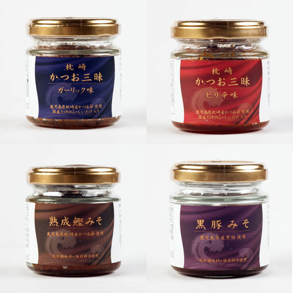 鹿児島県枕崎産のかつお節をまろやかなオイルベースに仕立てました。 シャキシャキっと歯ごたえのある国産たけのこの食感と、香り深い国産椎茸に、かつおの旨味がたまらない逸品です。 しっかり味なのにまろやか。それぞれの素材が引き立つ逸品となっております。 ほんのり甘めで仕上げておりますので、育ちざかりのお子様にも喜んでお召し上がりいただけます。 ■かつお三昧・熟成鰹みそ・黒豚みそ4種4本セット 内容量: 枕崎かつお三昧(ガーリック味)70g、枕崎かつお三昧(ピリ辛旨味)70g、熟成鰹みそ90g、黒豚みそ70g 配達方法:宅配便 配達日:申し込み後1週間以内に発送します(土日祝除く)。 熨斗:不可 ※送料について、お届け先が北海道は220円、沖縄は1,804円となります。ご請求時に変更となります。(各税込) ※G-Callショッピングにて他の商品と一緒にご購入の場合、別途送料がかかる場合があります。その際はご注文後ご連絡いたします。 原材料: ■枕崎かつお三昧(ガーリック味) なたね油(国内製造)、かつお(枕崎製造)、醤油、砂糖、発酵調味料、還元水飴、たけのこ、昆布だし、ガーリック、椎茸、食塩、酵母エキス(原材料の一部に小麦、大豆を含む) ■枕崎かつお三昧(ピリ辛旨味) なたね油(国内製造)、かつお(枕崎製造)、醤油、砂糖、発酵調味料、唐辛子、たけのこ、還元水飴、ガーリック、昆布だし、食塩、たんぱく加水分解物、砂糖・異性化液糖、醸造酢、椎茸、酵母エキス、魚介エキス、えびパウダー、生姜、魚醤/調味料(アミノ酸等)、酸味料、パプリカ色素、増粘多糖類(一部に小麦、えび、大豆を含む) ■熟成鰹みそ 麦みそ(国内製造)、還元水飴、かつお節(枕崎製造)、加工黒糖粉末、砂糖、ごま、生姜、発酵調味料、醤油、魚醤(魚介類)、(原材料の一部に小麦、大豆、ごま、魚醤(魚介類)を含む) ■黒豚みそ 原材料:味噌(鹿児島県製造)、砂糖、黒豚肉(鹿児島県産)、水飴、本みりん、ごま(一部に大豆、ごま、豚肉を含む)