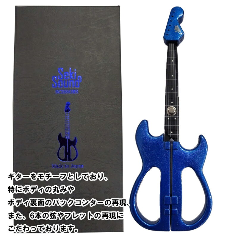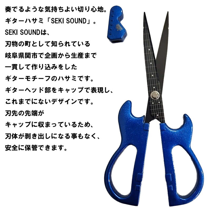 奏でるような気持ちよい切り心地。ギターハサミ「Seki Sound」。 Seki Soundは、刃物の町として知られている“岐阜県関市”で企画から生産まで一貫して作り込みをしたギターモチーフのハサミです。 ギターをモチーフとしており、特にボディの丸みやボディ裏面のバックコンターの再現、また、6本の弦やフレットの再現にこだわっております。更に、ギターヘッド部をキャップで表現し、これまでにないデザインとなります。 刃物の町岐阜県関市の刃物職人が1本1本丁寧に刃付けを行っており、厚紙等も気持ちよくカットできます。 フッ素コート仕上げのため、テープ類を切ってもベタつきにくくなっております。 スタンド付きのため、ハサミとして使わない時でも部屋に飾って楽しむことができます。 インテリアにも最適です。 キャップに収まっているため、刃体が剥き出しになる事もなく、安全に保管できます。 SS-35はラメ仕様。 美しいメタリックブルーとパールホワイトの2カラーからお選びいただけます。 【仕様】 ●全長:200mm ●刃厚:2.0mm ●重量:70g ●スタンド重量:25g ●材質:ブレード:ステンレス ●材質:ハンドル:ABS ●付属品:スタンド(重量:25.0g / 材質:エストラマー) ●生産:日本製