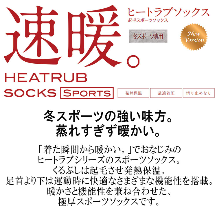 HEATRUB SOCKS 速暖シリーズ 冬スポーツの強い味方。 蒸れすぎず暖かい。 「着た瞬間から暖かい。」でおなじみのヒートラブシリーズのスポーツソックス。 くるぶしは起毛させ発熱保温。 足首より下は運動時に快適なさまざまな機能性を搭載。 暖かさと機能性を兼ね合わせた極厚スポーツソックスです。 ◆◇◆メール便配送のご注意◆◇◆ 厚みのあるパッケージ等に入っている場合は、メール便規格に収まるよう開封して折りたたむ場合がございます。 タグでまとめられている厚みのある商品は、タグを外してばらしての梱包となります。予めご了承ください。メーカー希望小売価格はメーカーサイトに基づいて掲載しています