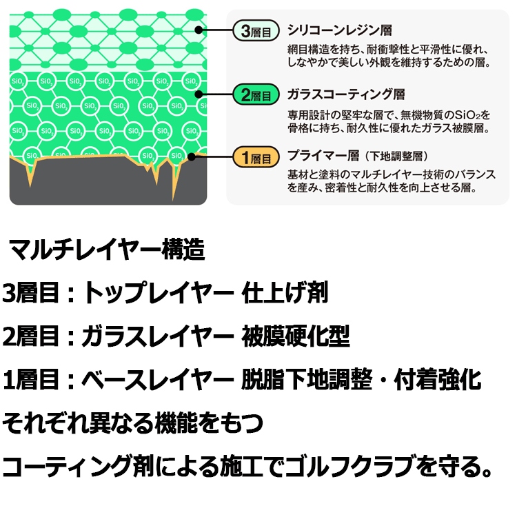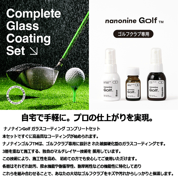 ナノナインGolf ガラスコーティング コンプリートセット 15本セットですぐに高品質なコーティングが始められます。 ナノナインゴルフTMは、ゴルフクラブ専用に設計さ れた被膜硬化型のガラスコーティングです。 3層を重ねて施工する、独自のマルチレイヤー技術を採用しています。 この技術により、施工性を高め、 初めての方でも安心してご使用いただけます。 各層はそれぞれ防汚、撥水機能や耐衝撃性、耐摩 耗性などの機能性に特化しており、これらを組み合わせることで、あなたの大切なゴルフクラブをキズや汚れから、しっかりと保護します。メーカー希望小売価格はメーカーサイトに基づいて掲載しています