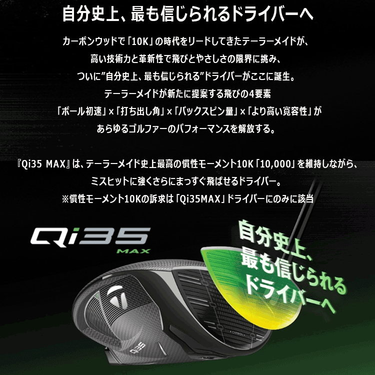 テーラーメイド Qi35 MAX ドライバー Diamana カーボン 日本仕様 自分史上、最も信じられるドライバーへ カーボンウッドで「10K」の時代をリードしてきたテーラーメイドが、高い技術力と革新性で飛びとやさしさの限界に挑み、ついに”自分史上、最も信じられる”ドライバーがここに誕生。 テーラーメイドが新たに提案する飛びの4要素「ボール初速」×「打ち出し角」×「バックスピン量」×「より高い寛容性」があらゆるゴルファーのパフォーマンスを解放する。 『Qi35 MAX』は、テーラーメイド史上最高の慣性モーメント10K「10,000」を維持しながら、ミスヒットに強くさらにまっすぐ飛ばせるドライバー。 ※慣性モーメント10Kの訴求は「Qi35MAX」ドライバーにのみに該当 付属品:専用ヘッドカバー ※トルクレンチは付属しません メーカー希望小売価格はメーカーサイトに基づいて掲載しています