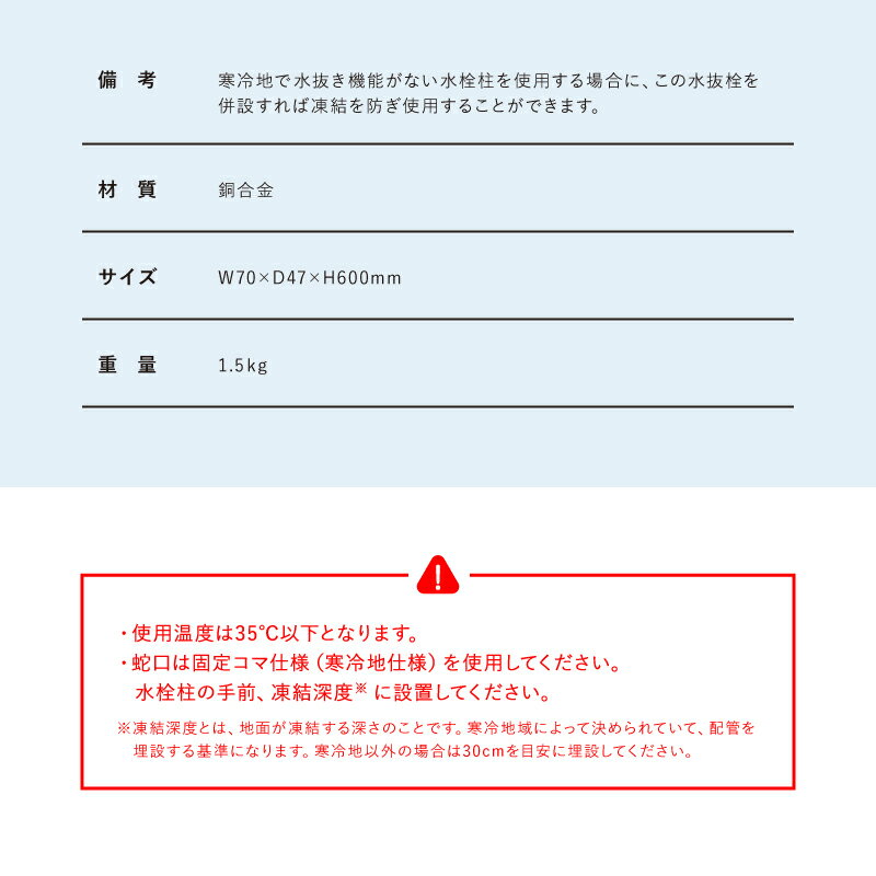 注意事項・使用温度は35℃以下となります。 ・蛇口は固定コマ仕様(寒冷地仕様)を使用してください。水栓柱の手前に凍結深度※に設置してください。 (※凍結深度とは、地面が凍結する深さのことです。寒冷地域によって決められていて、配管を埋設する基準になります。寒冷地以外の場合は30cmを目安に埋設してください。)配送について※こちらの商品はメーカー直送品のため、代引きをご利用いただけません。 ※北海道・沖縄・離島・一部地域への発送には、追加料金がかかりますので、ご了承ください。不凍水抜栓 MVのみ 0.6m 口径13mm TK3-MV-13060寒冷地で水抜き機能のない水栓柱を使用する際に必要なのが、この水抜栓です。 水栓柱に併設すれば、水抜き機能のない水栓柱でも、凍結知らずの快適なガーデンライフをおくることができます。 関連商品はこちら不凍水栓 アクアルージュ アイス 1.2m ...32,900円【送料無料】ジラーレ 開閉防止タイプ ...29,040円ガーデンパン 380【オンリーワンクラブ...33,200円[上下蛇口セット] アルミ立水栓 水栓柱 ...30,850円不凍水栓柱 UNISON ユニソン エインスタ...73,800円