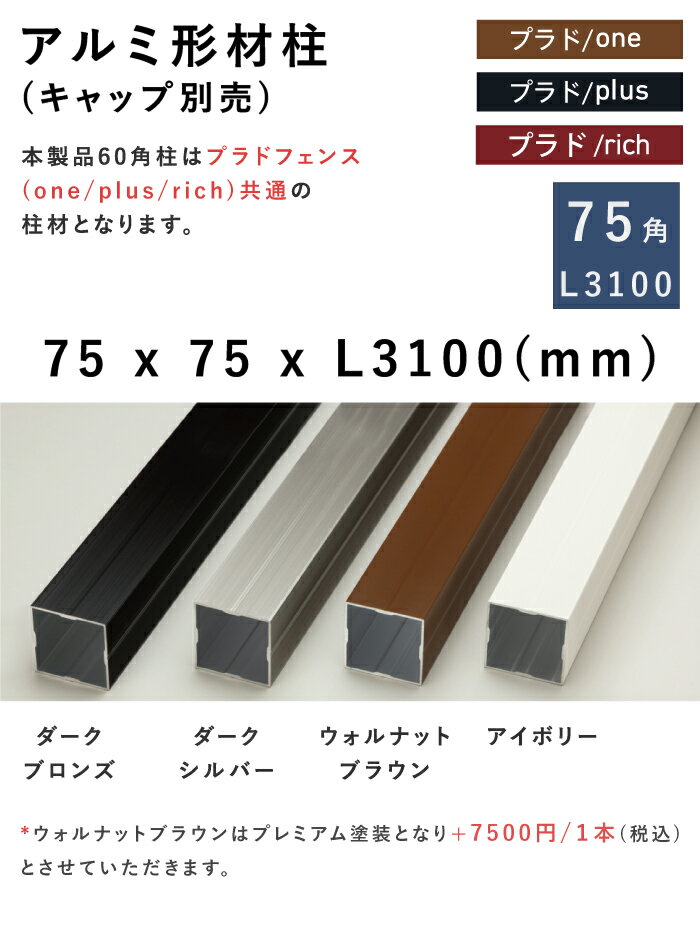 【75角柱 L3100 プラドフェンス共通】アルミ形材 支柱 単品 75x75xL3100mm プラド/one・plus・rich 共通 4カラー キャップ別売 目隠しフェンス 境界 仕切り 柵 横貼 縦貼 外構 エクステリア 施主支給 DIY グローベン plad プラドワン/プラス/リッチ