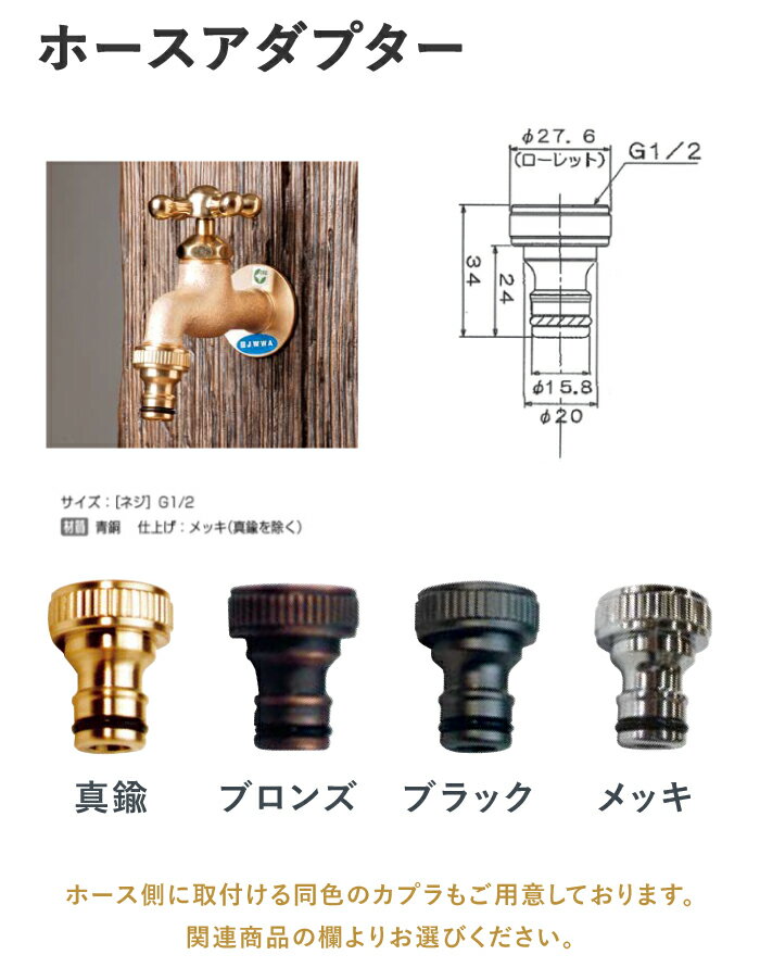 ホースアダプター ホースジョイント【オンリーワンクラブ】蛇口アクセサリー Adapter ホース接続 立水栓 水廻り 散水 水やり 庭まわり 真鍮:GM3-F-501 ブロンズ:GM3-F-503 ブラック:GM3-F-505 メッキ:GM3-F-410